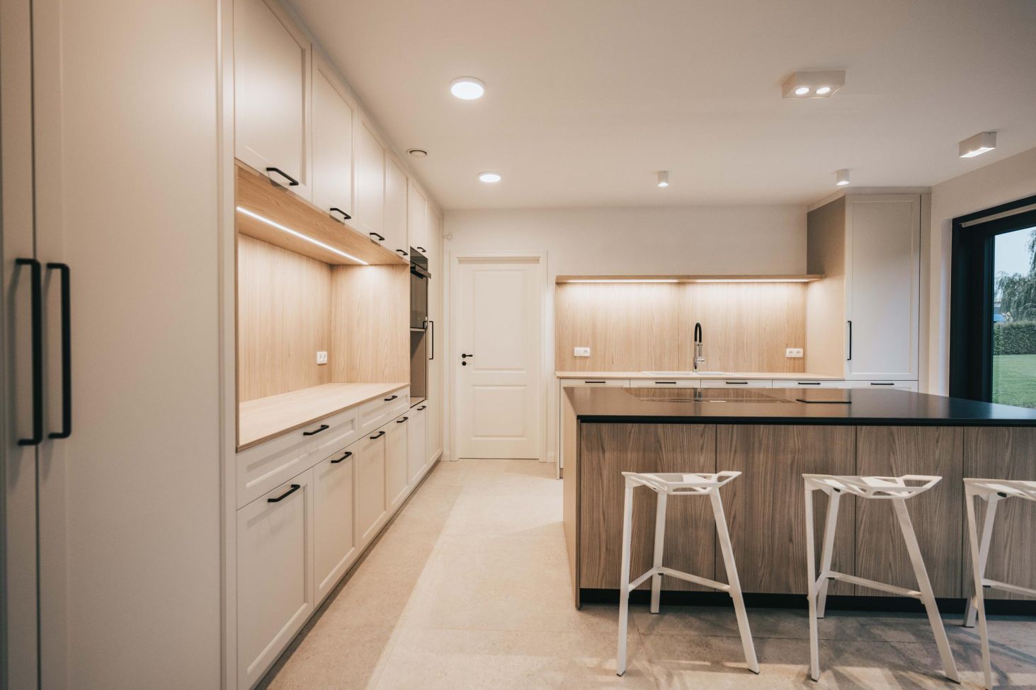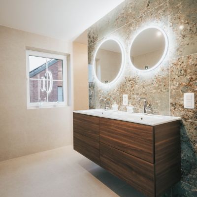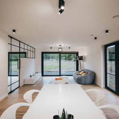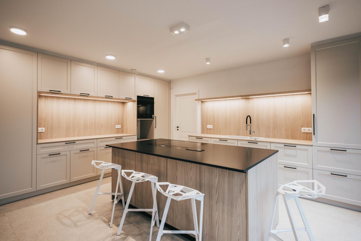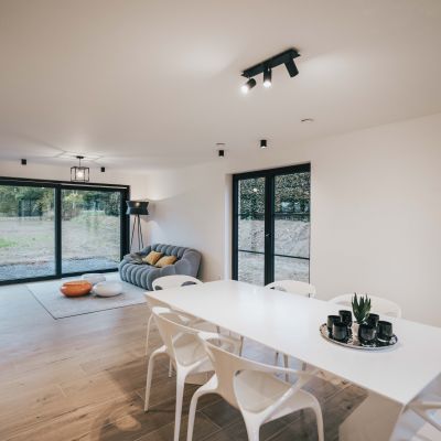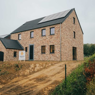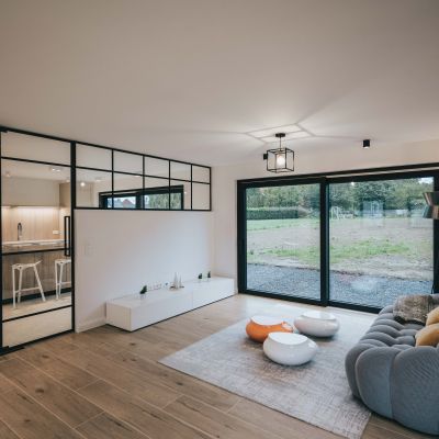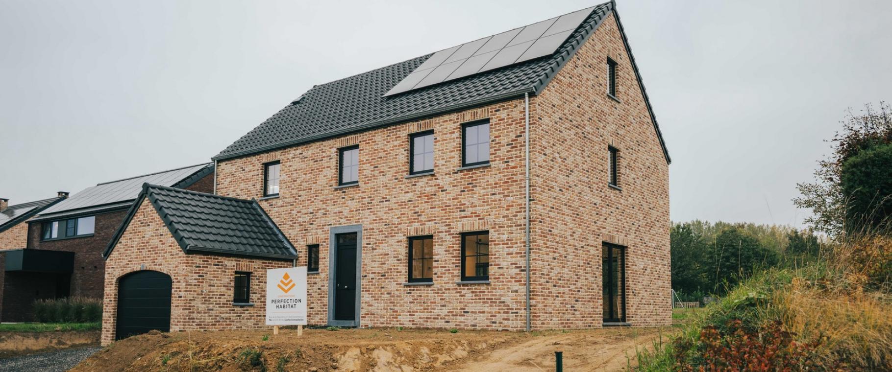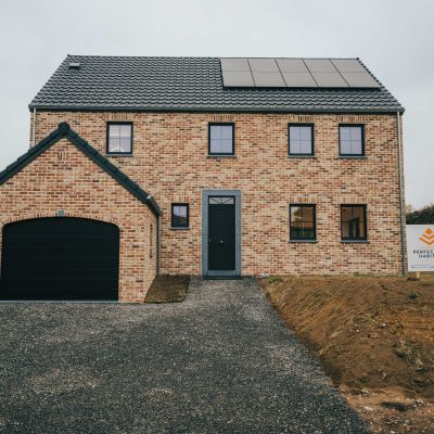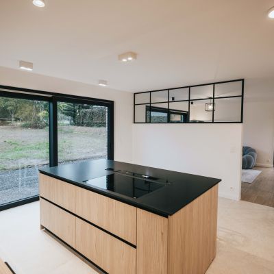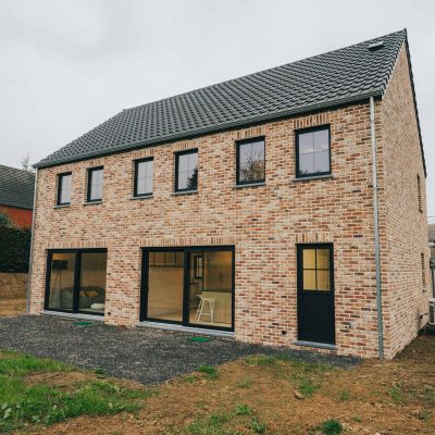 Nous avons construit cette maison clé sur porte à Faimes, en province de Liège, elle a été inspirée de la PH14, l'Intemporelle, et a été entièrement réalisée pour les besoins et les envies de nos clients. Ils la voulaient du style cottage, avec cette brique orangée de la marque Vandersanden® et ses châssis noirs grainés à croisillons intégrés entre le vitrage qui donnent un look contrasté. À l'intérieur, le séjour et la cuisine sont séparés par une large porte vitrée en verre trempé ainsi qu'un cadre fixe placé au-dessus d'un muret, cela permet de répartir la luminosité de façon uniforme. À l'étage, une salle de bain incluant une baignoire, une douche à l'italienne et un meuble double vasque vient s'ajouter aux 3 chambres, au dressing et à l'espace bureau.