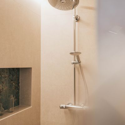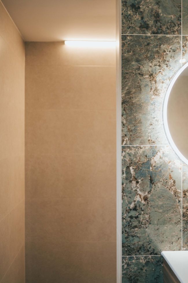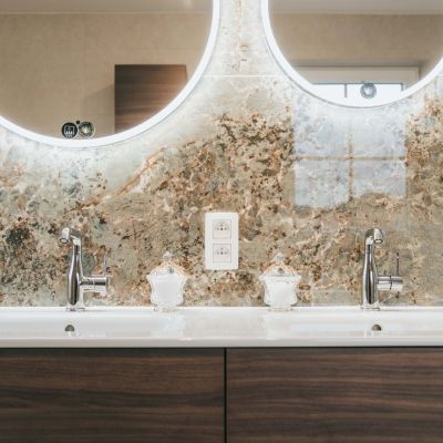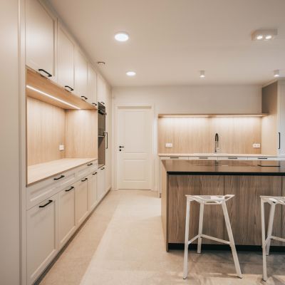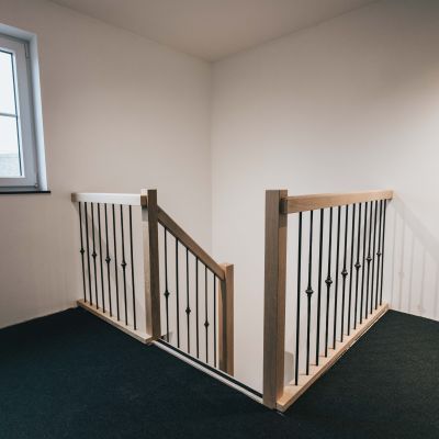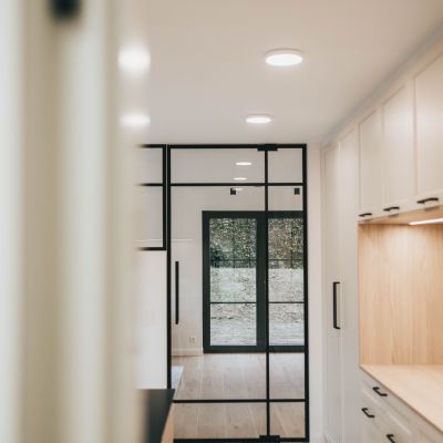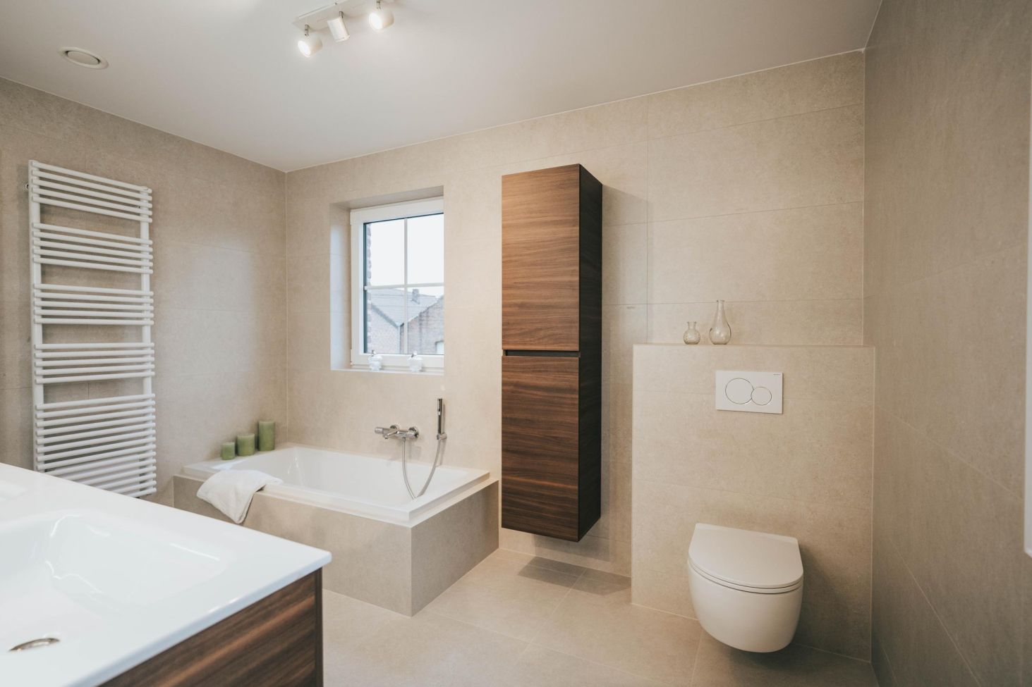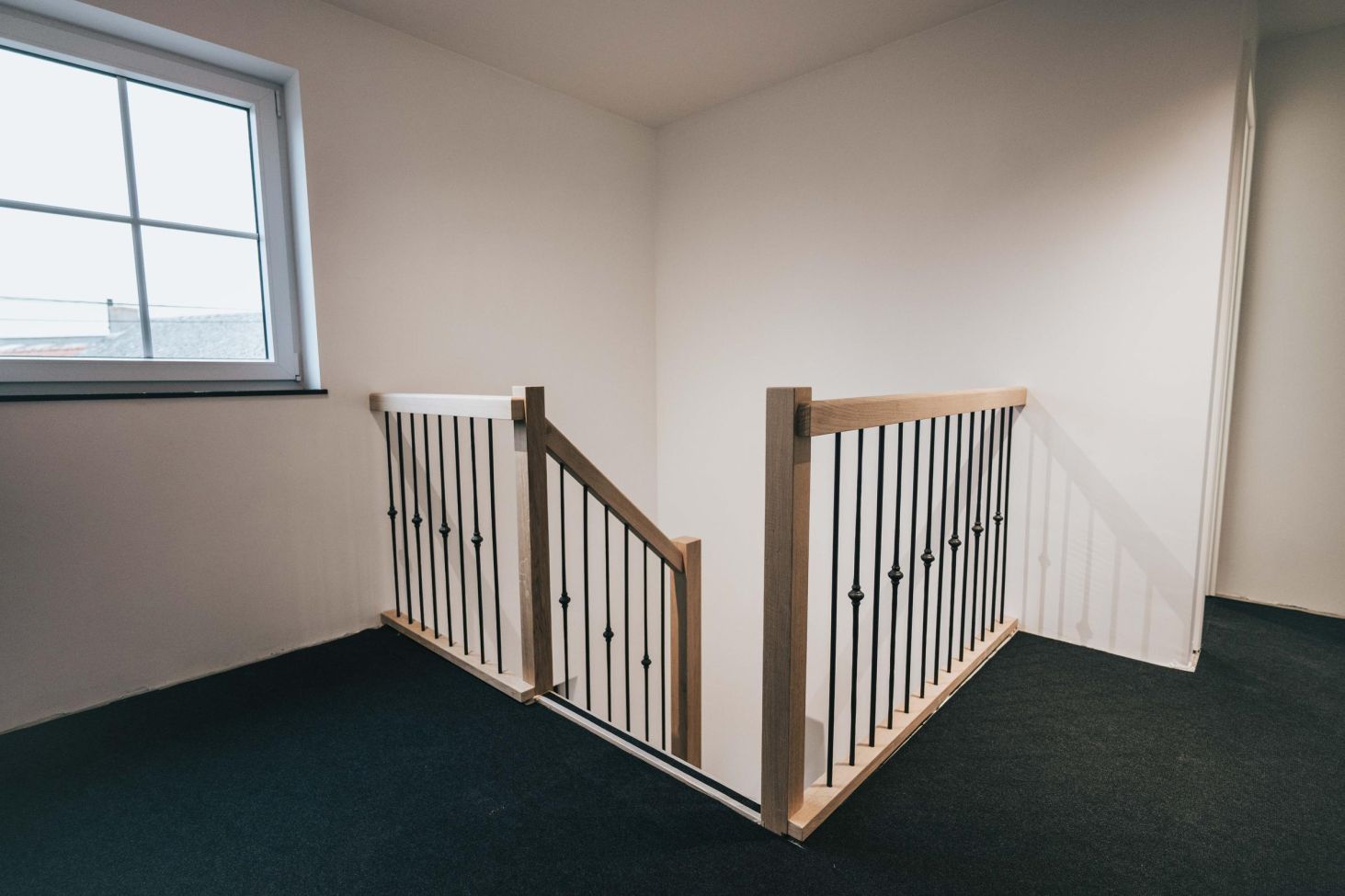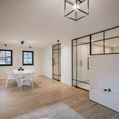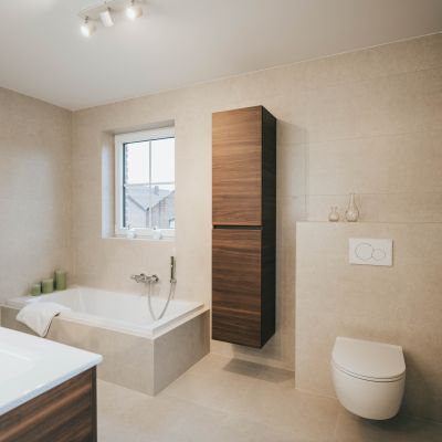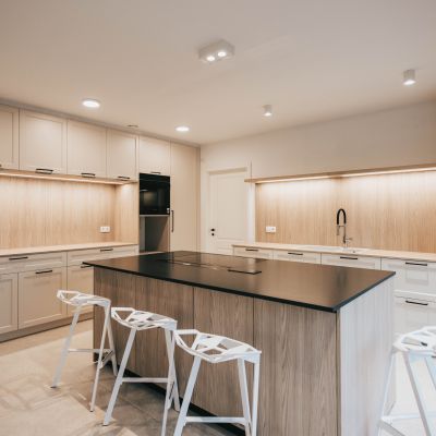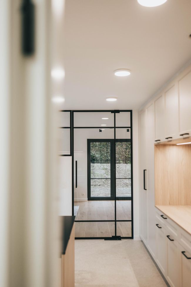 Nous avons construit cette maison clé sur porte à Faimes, en province de Liège, elle a été inspirée de la PH14, l'Intemporelle, et a été entièrement réalisée pour les besoins et les envies de nos clients. Ils la voulaient du style cottage, avec cette brique orangée de la marque Vandersanden® et ses châssis noirs grainés à croisillons intégrés entre le vitrage qui donnent un look contrasté. À l'intérieur, le séjour et la cuisine sont séparés par une large porte vitrée en verre trempé ainsi qu'un cadre fixe placé au-dessus d'un muret, cela permet de répartir la luminosité de façon uniforme. À l'étage, une salle de bain incluant une baignoire, une douche à l'italienne et un meuble double vasque vient s'ajouter aux 3 chambres, au dressing et à l'espace bureau.