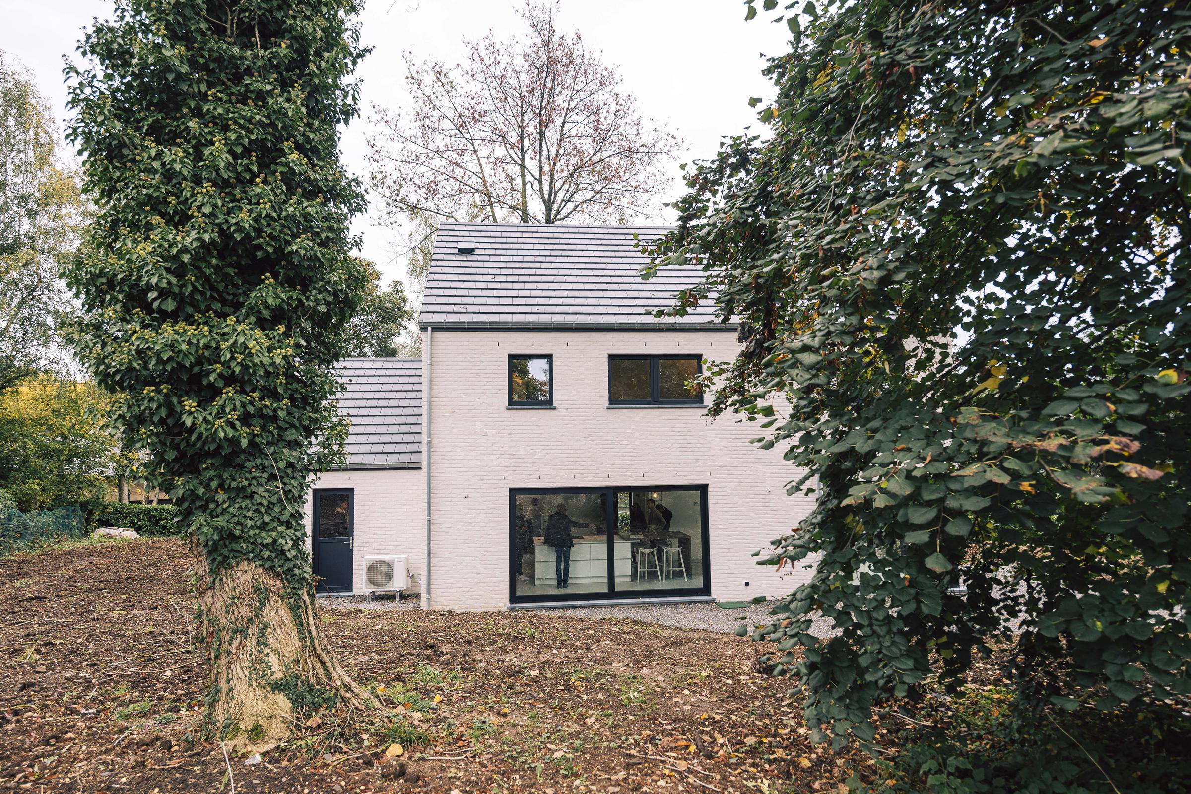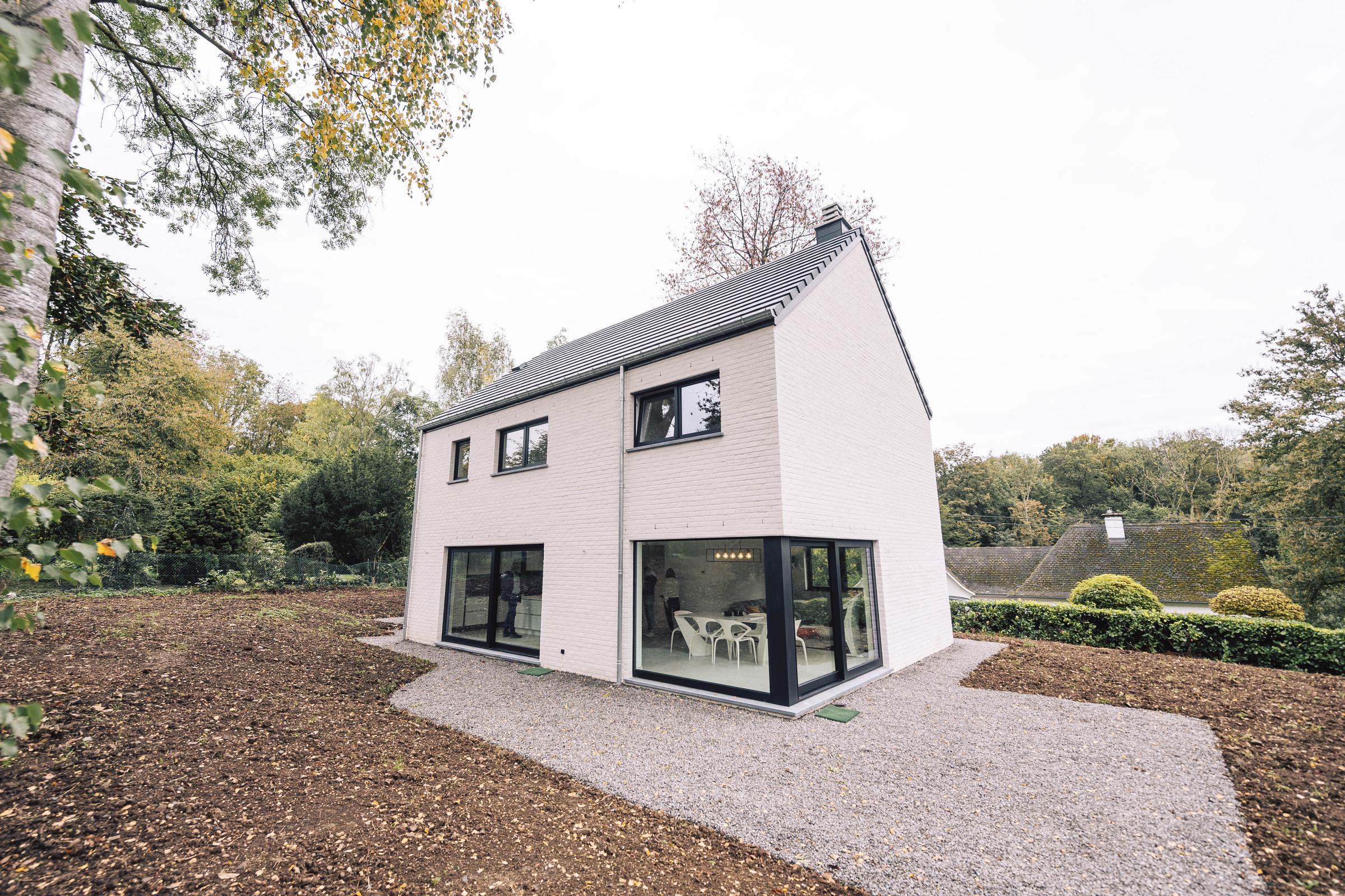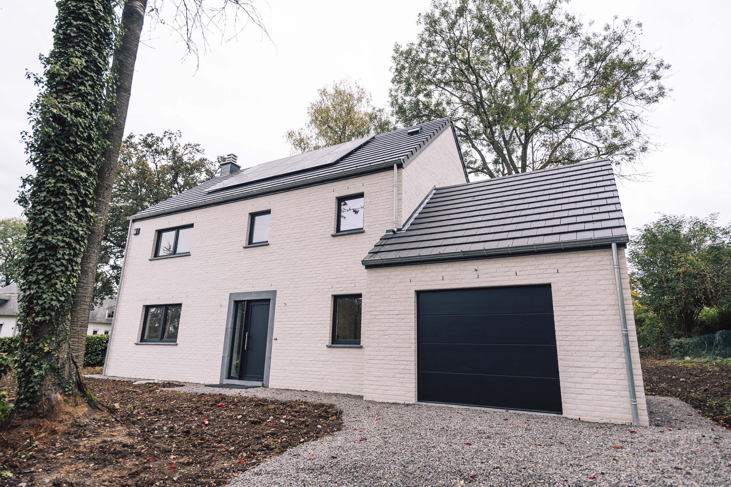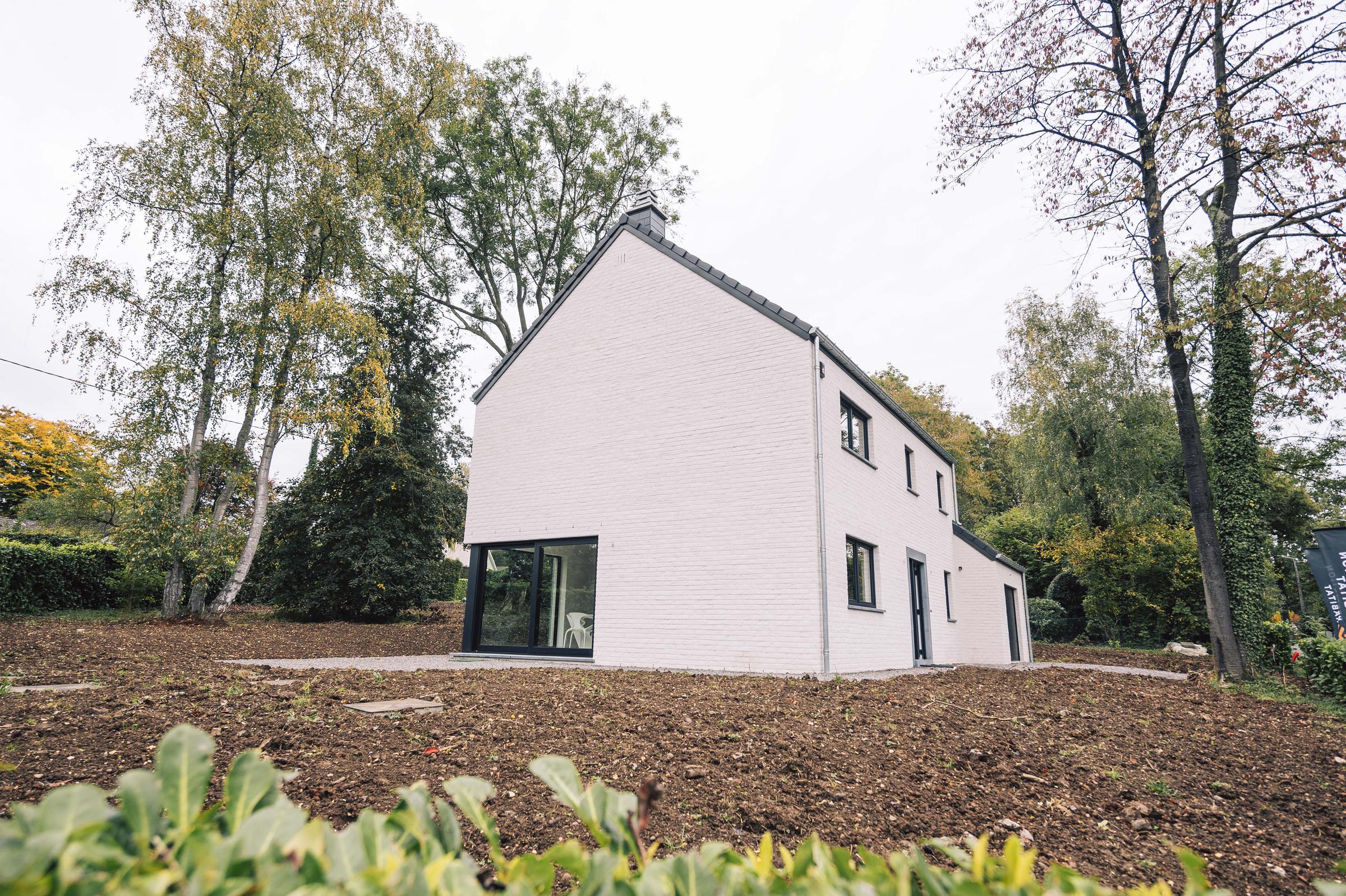 Nous avons construit cette maison clé sur porte à Boninne dans la province de Namur. Cette construction intemporelle, allie une brique blanche et des châssis foncés à merveille, sa grande baie vitrée d'angle donne du volume et une belle luminosité. Elle a été conçue à partir du modèle PH07