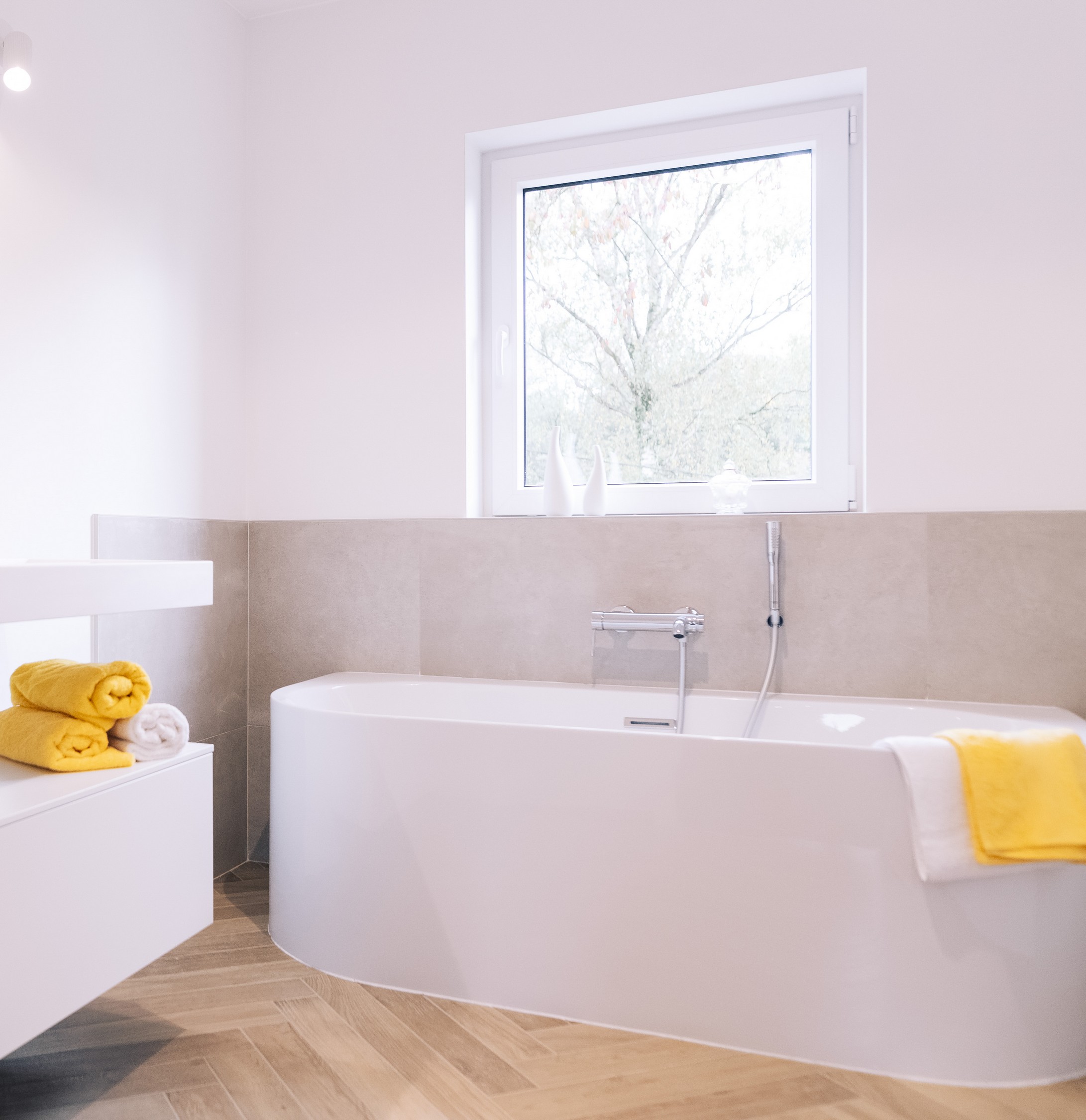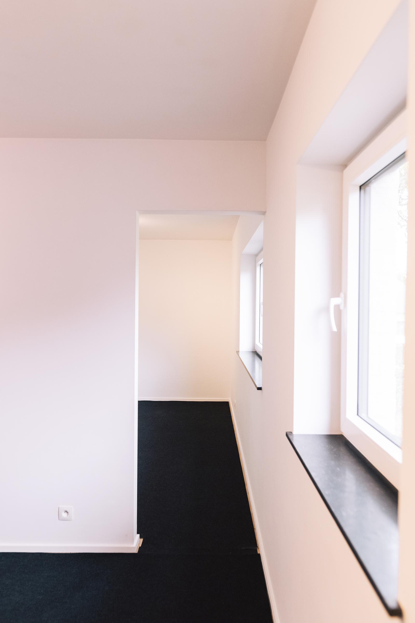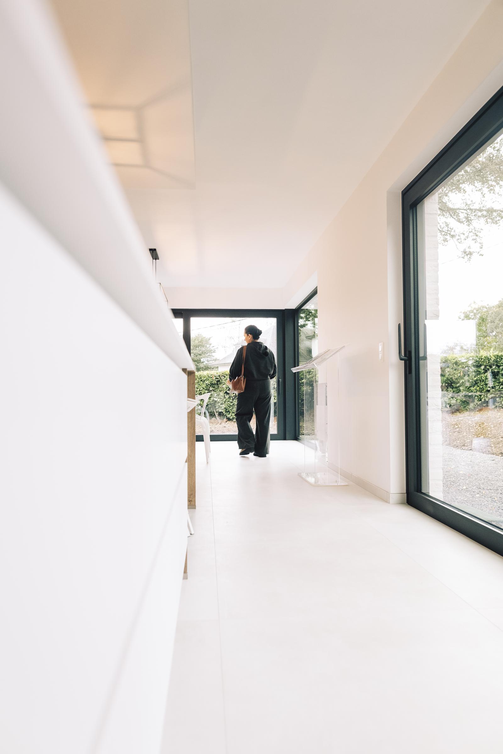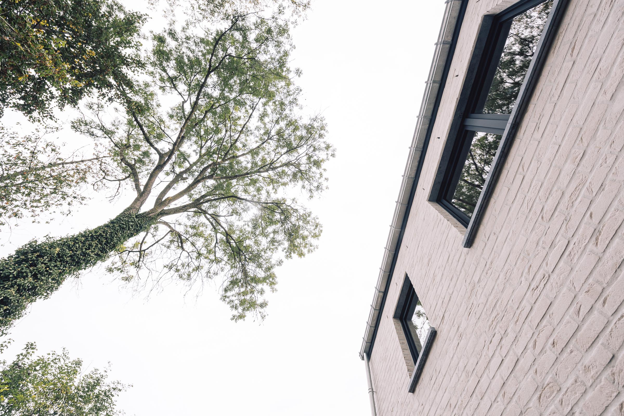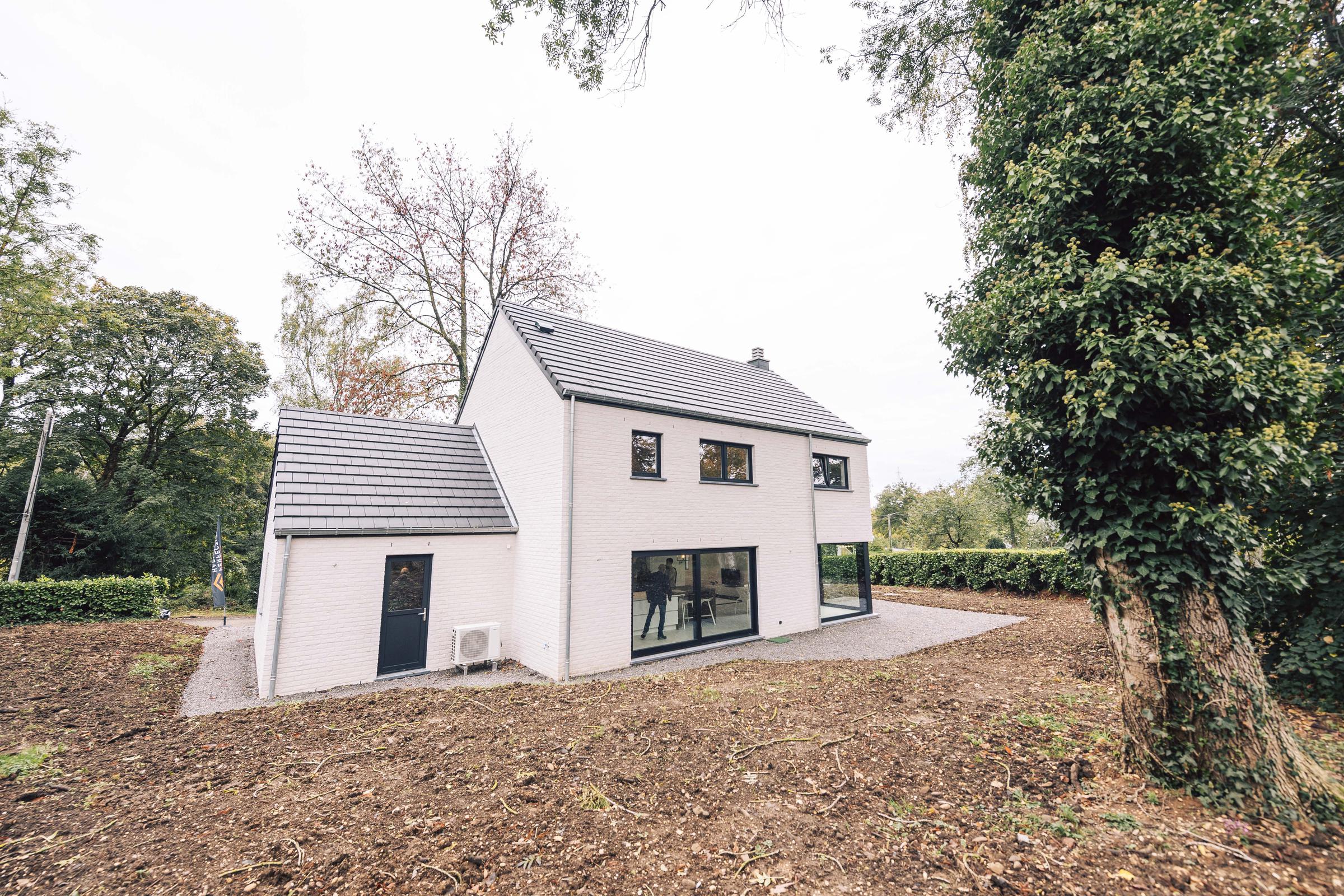 Nous avons construit cette maison clé sur porte à Boninne dans la province de Namur. Cette construction intemporelle, allie une brique blanche et des châssis foncés à merveille, sa grande baie vitrée d'angle donne du volume et une belle luminosité. Elle a été conçue à partir du modèle PH07