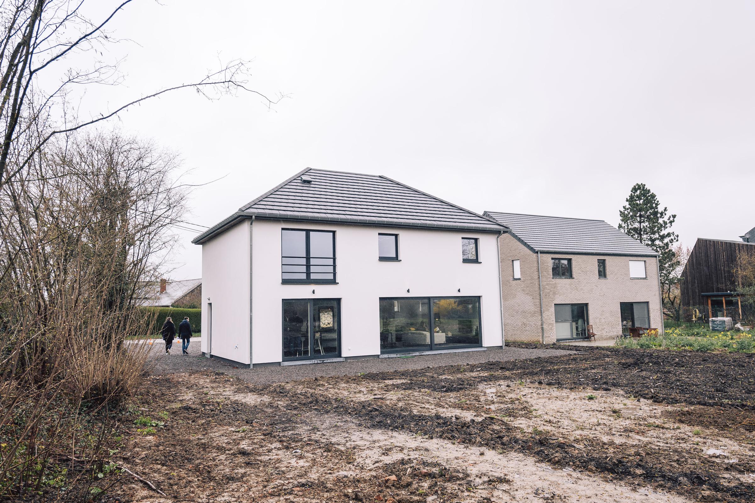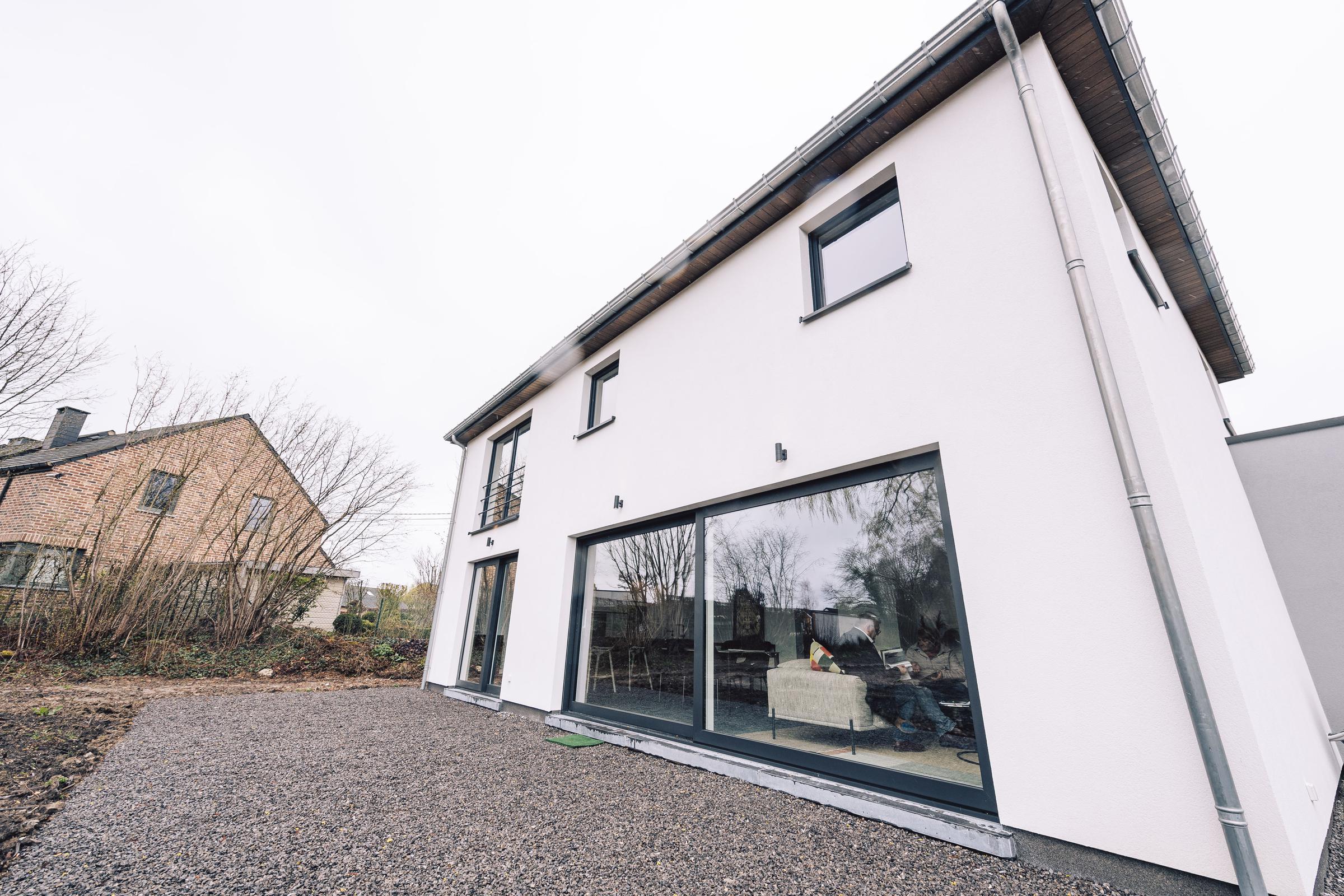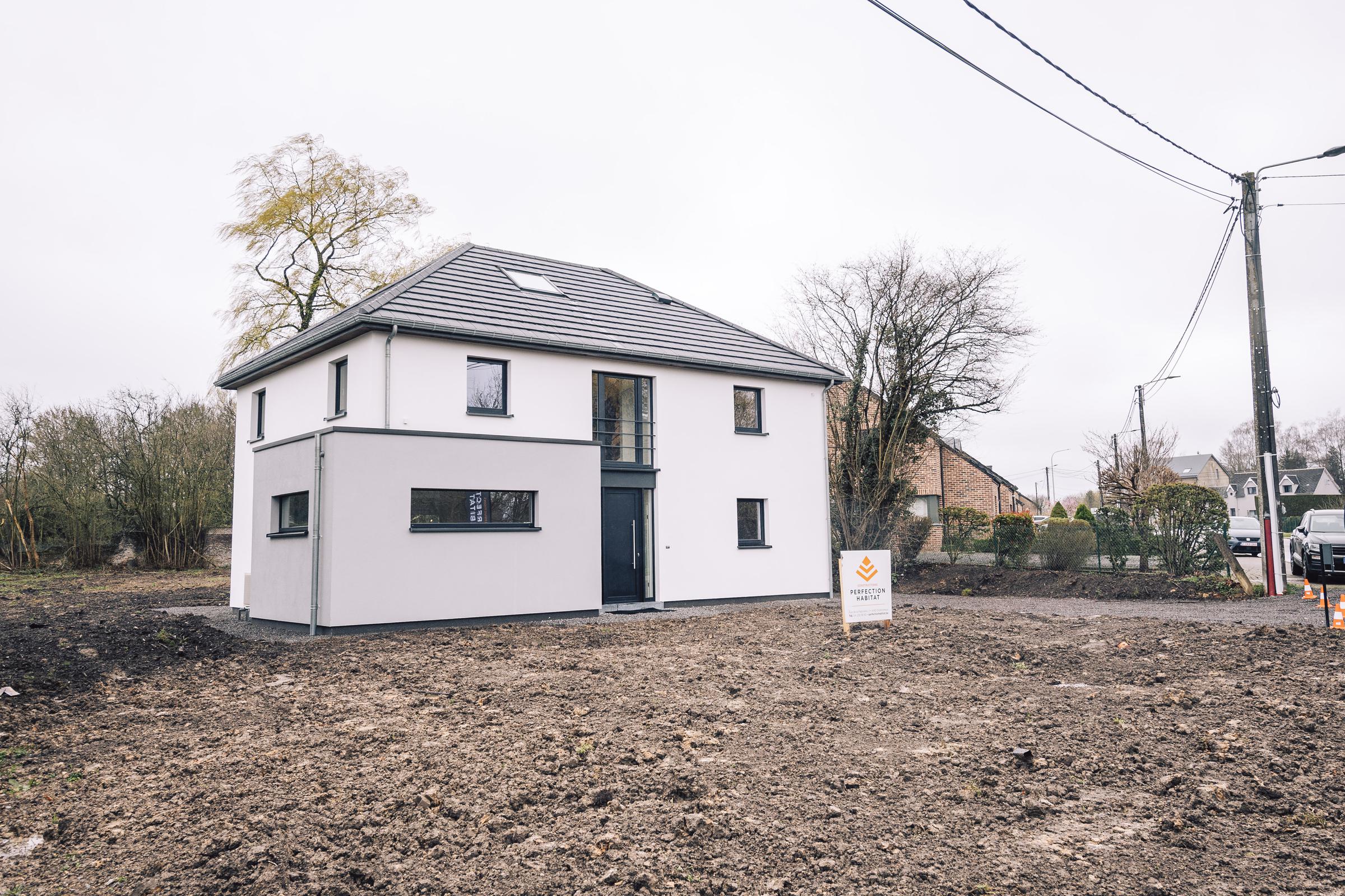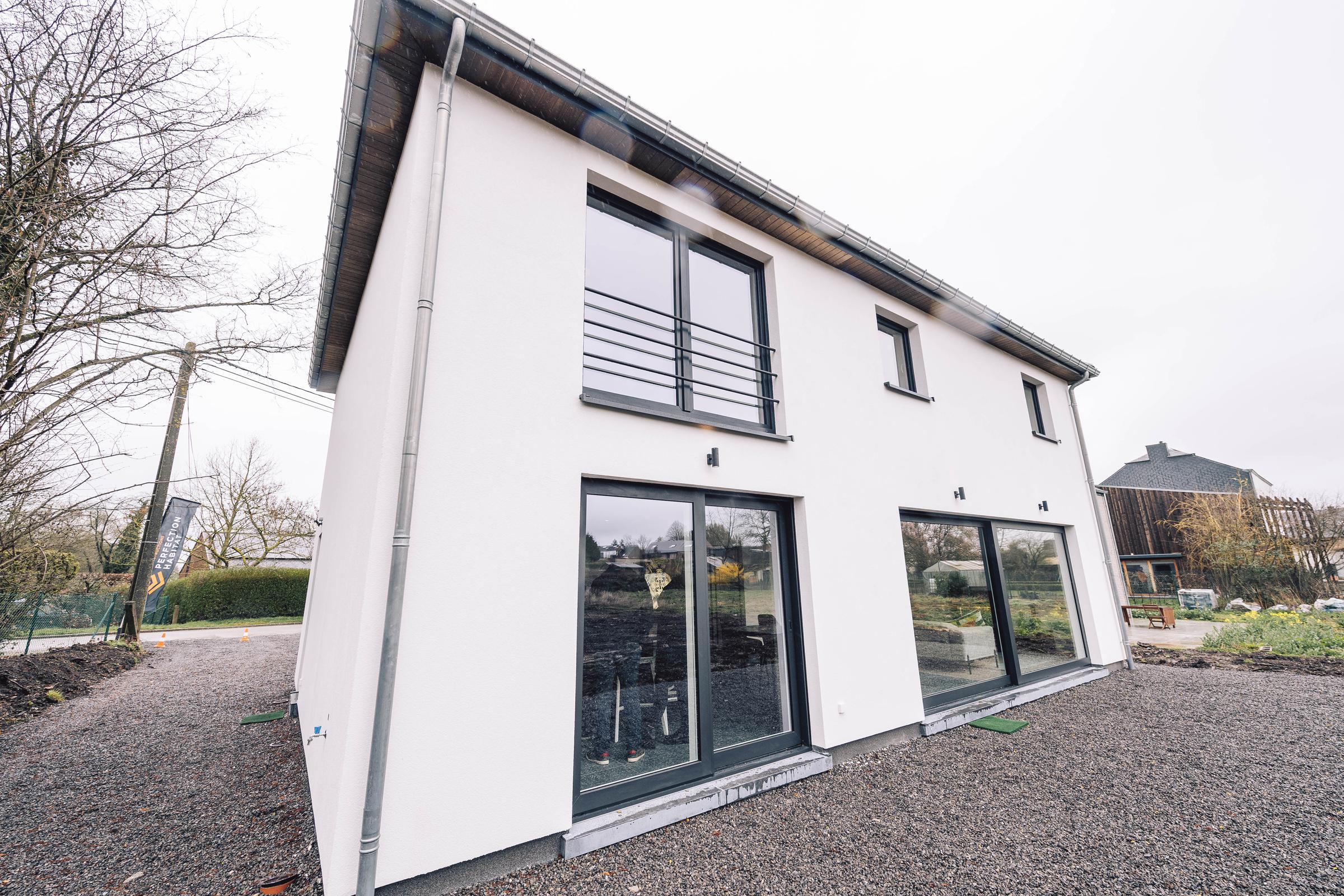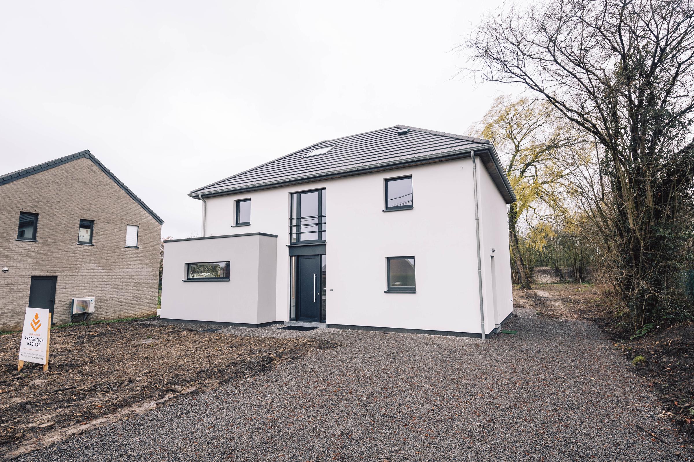 Nous avons construit cette maison clé sur porte à Cognelée, dans la province de Namur. D’un style atypique avec sa toiture 4 pans, son revêtement en crépi blancs sur le volume principal et gris clair sur le sortant et ses menuiseries noires, elle a été conçue à partir de notre modèle d'inspiration PH07, La Rassurante