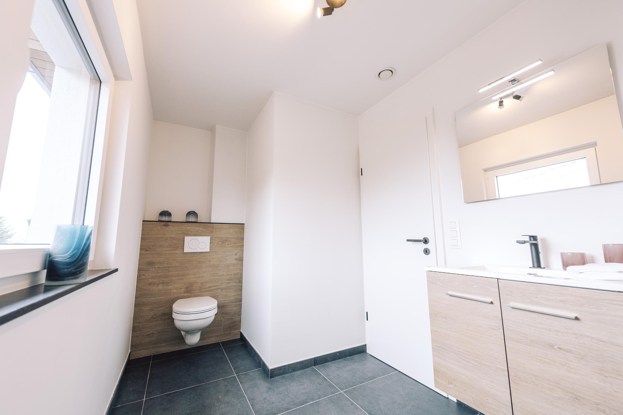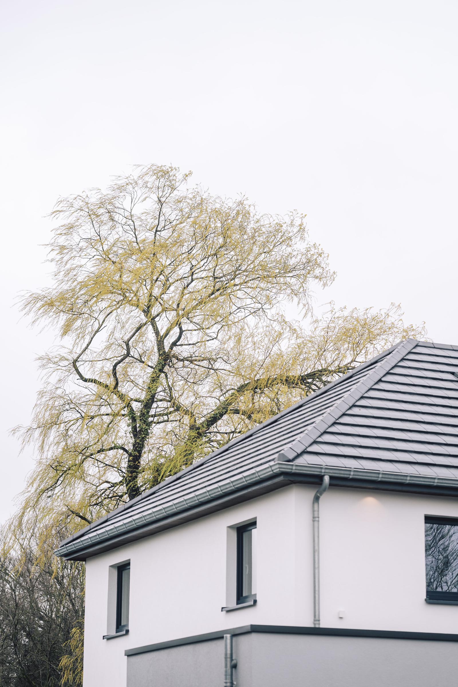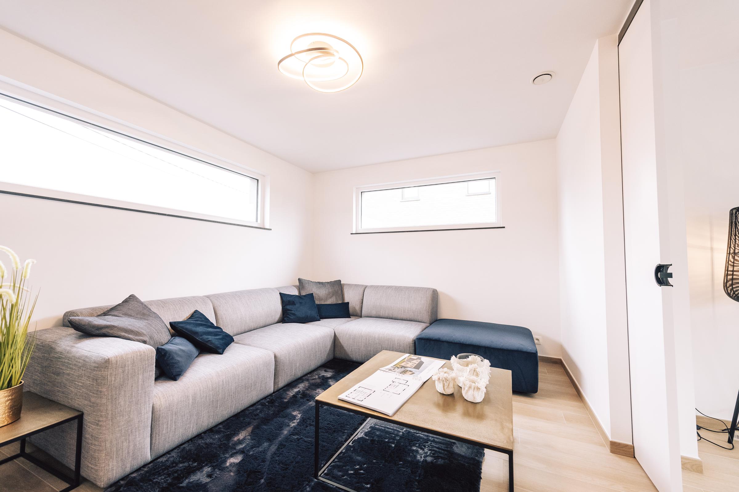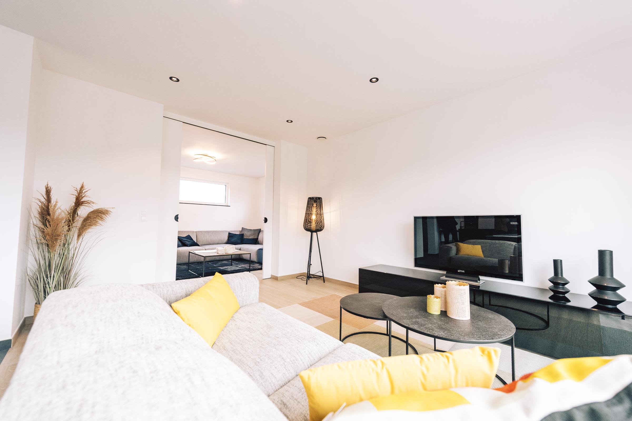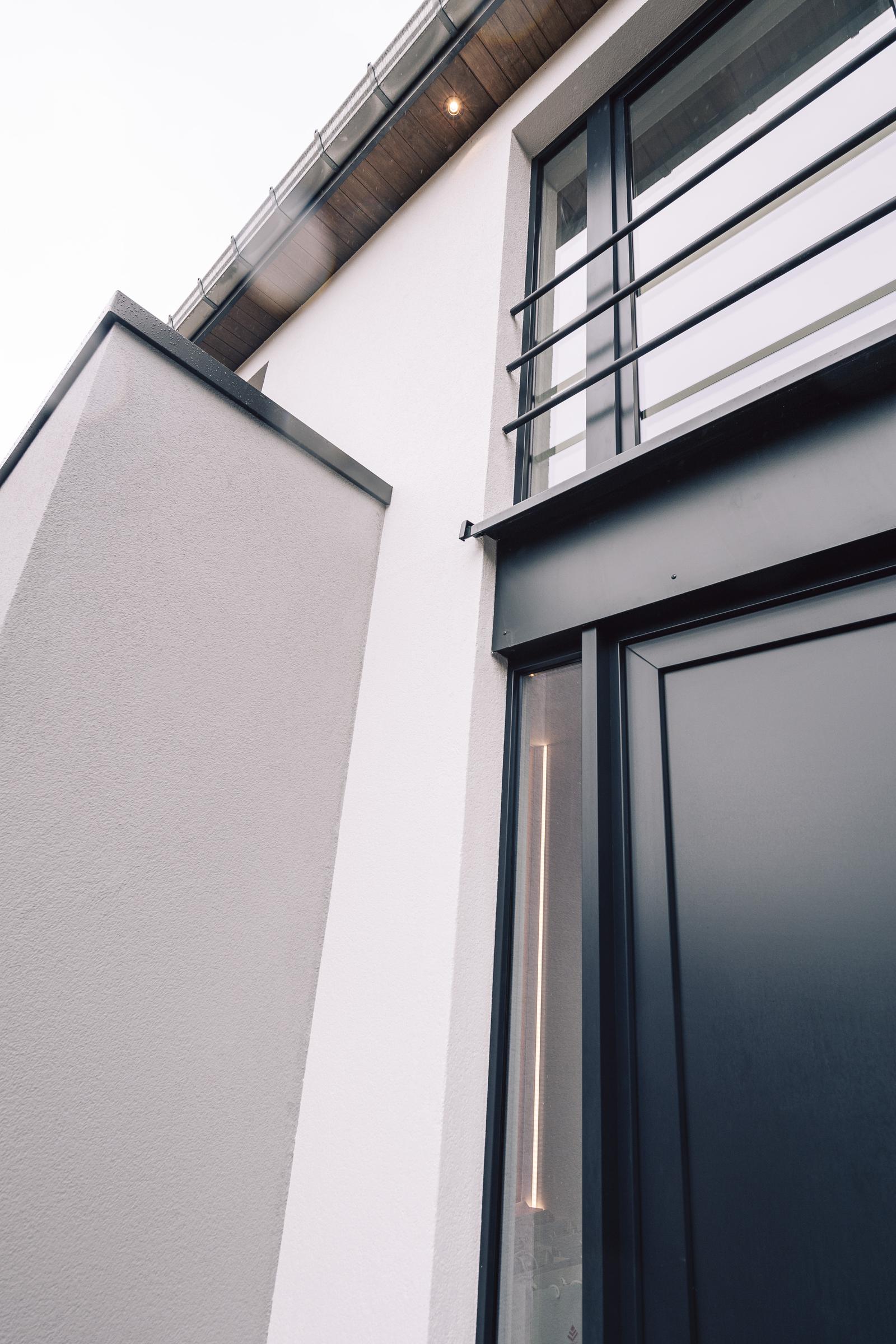 Nous avons construit cette maison clé sur porte à Cognelée, dans la province de Namur. D’un style atypique avec sa toiture 4 pans, son revêtement en crépi blancs sur le volume principal et gris clair sur le sortant et ses menuiseries noires, elle a été conçue à partir de notre modèle d'inspiration PH07, La Rassurante