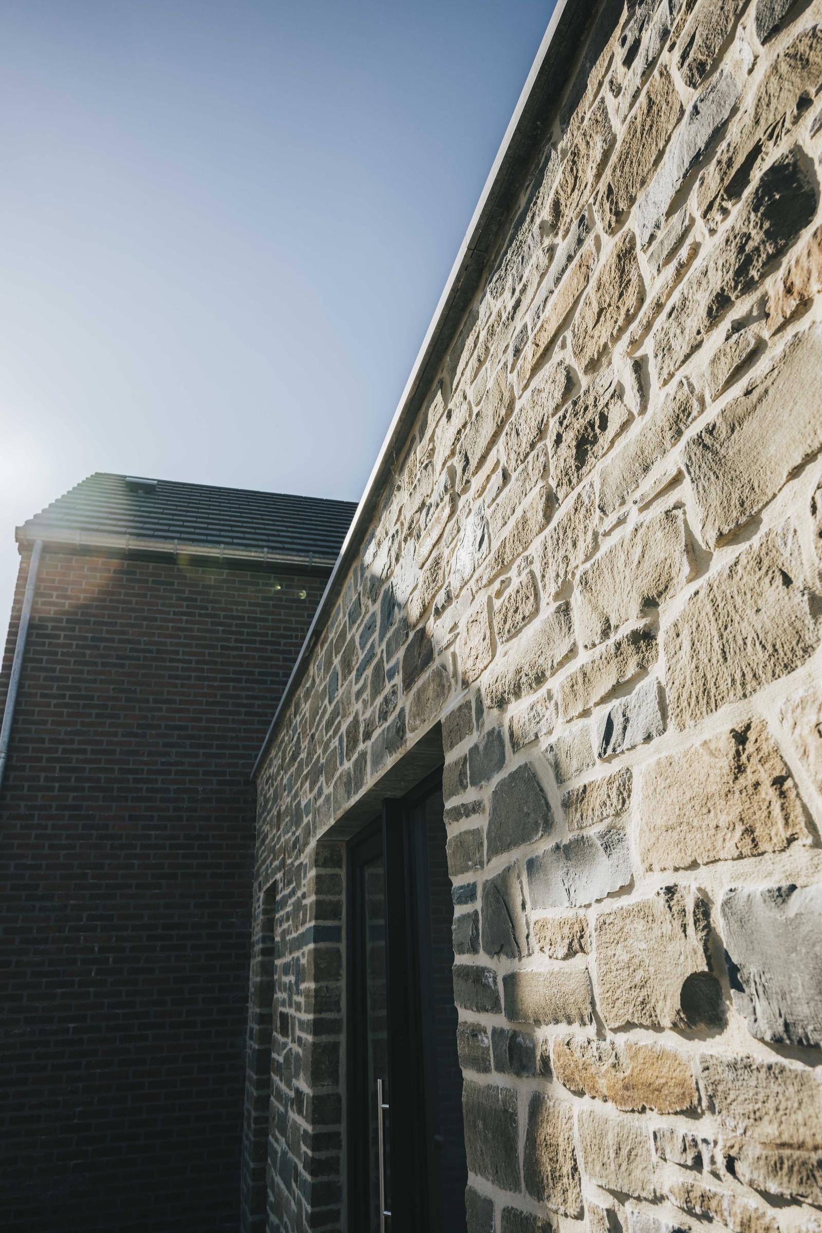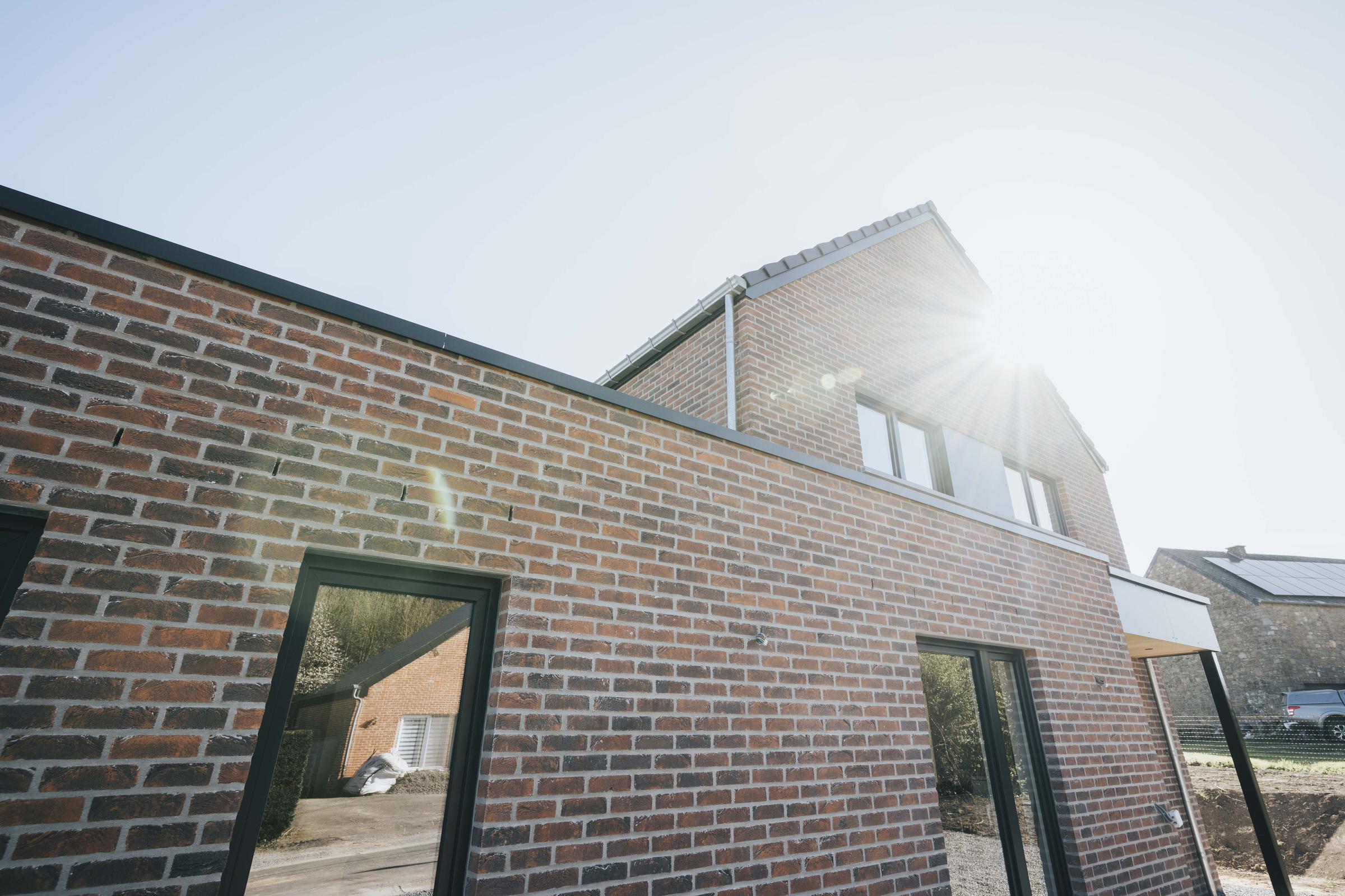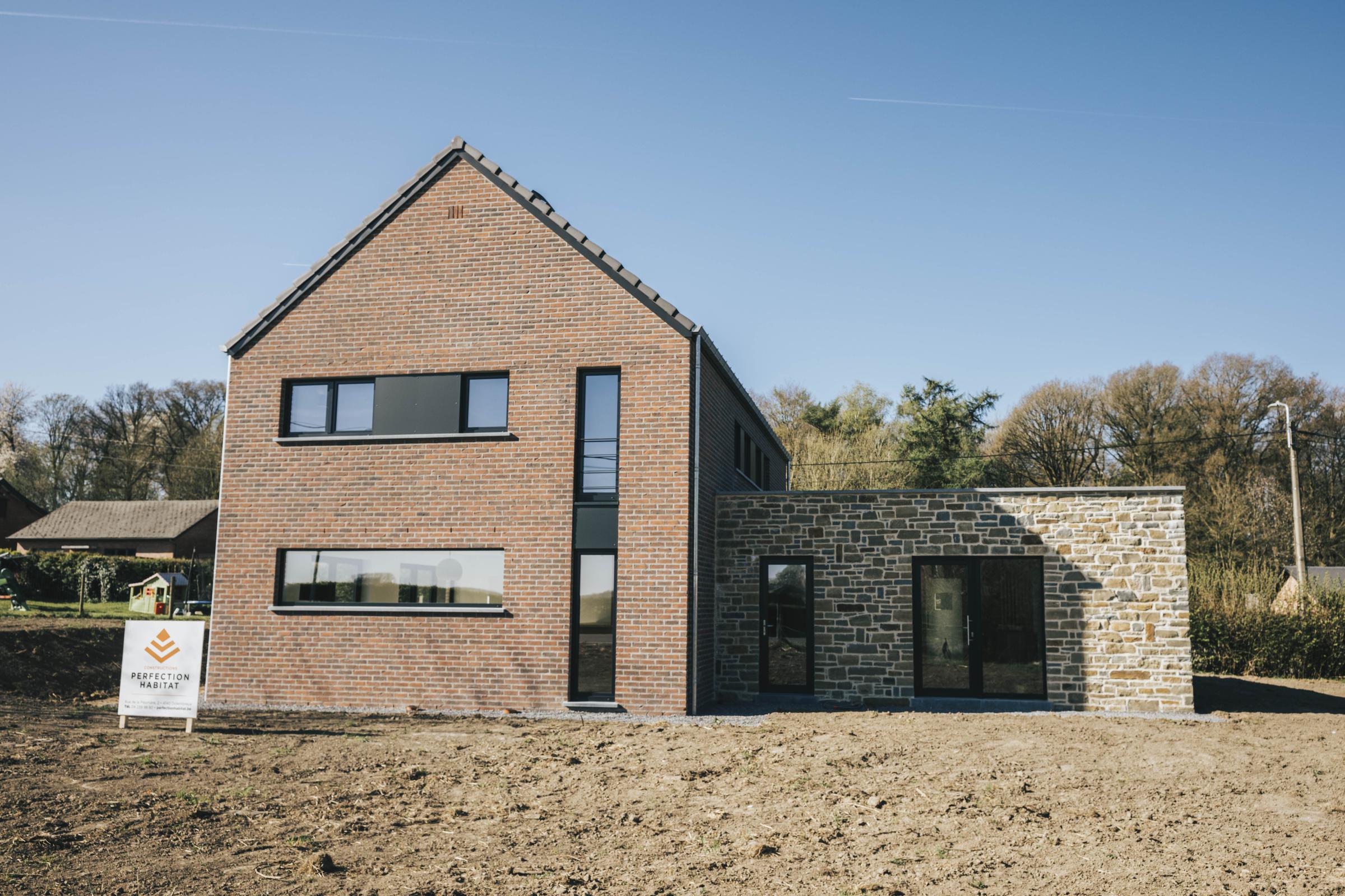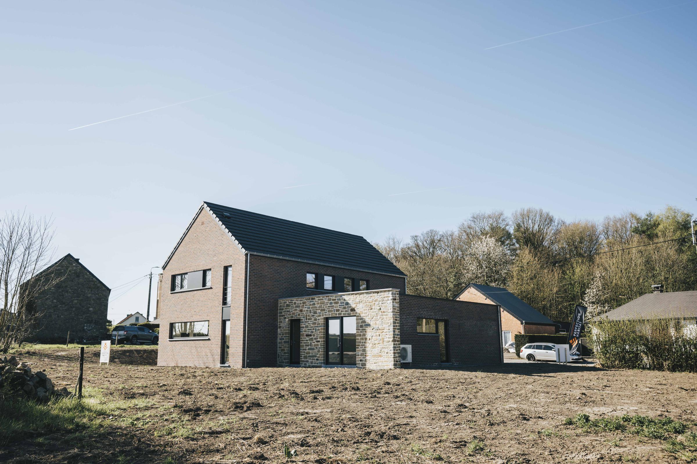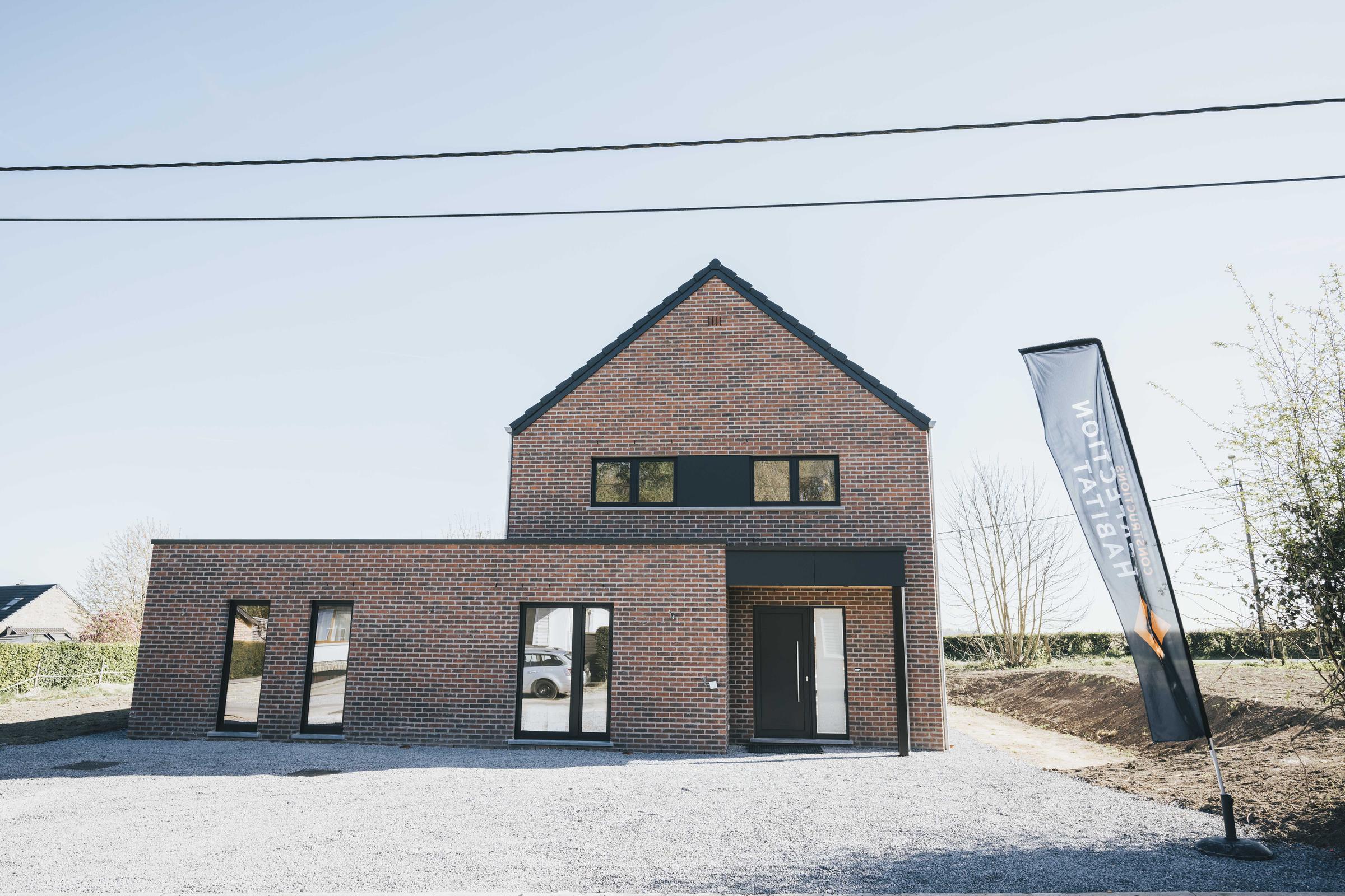 Nous avons construit cette maison clé sur porte à Ohey dans la province de Namur. Cette construction pignon à rue, inspirée de notre modèle PH21, La Transversale, intègre deux volumes différents : la maison privative et un espace professionnel dédié au salon de coiffure de la cliente. Avec son allure moderne, cette maisons neuve allie la brique rouge, le moellons grès du Bois d'Anthisnes et les menuiseries extérieures foncés à merveille. Découvrez les photos et la vidéo de cette maison récemment terminées par nos soins.