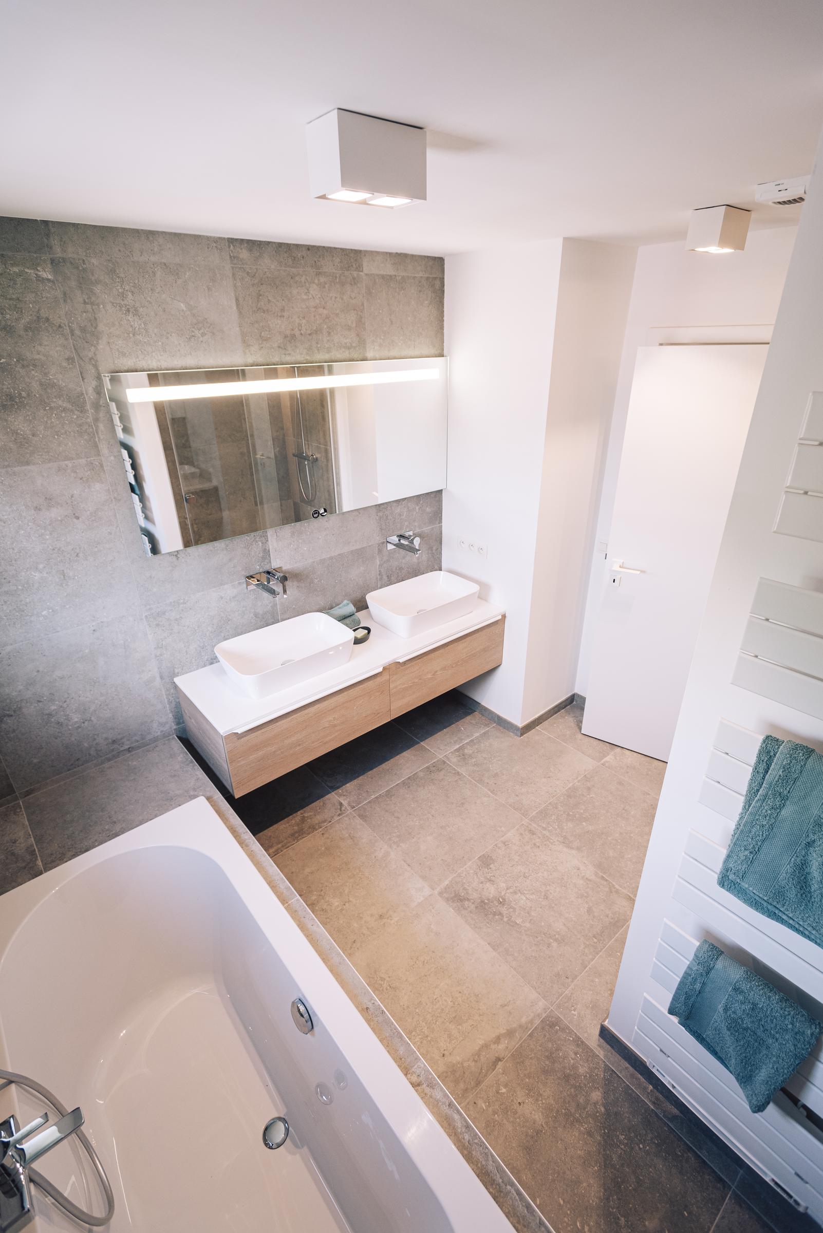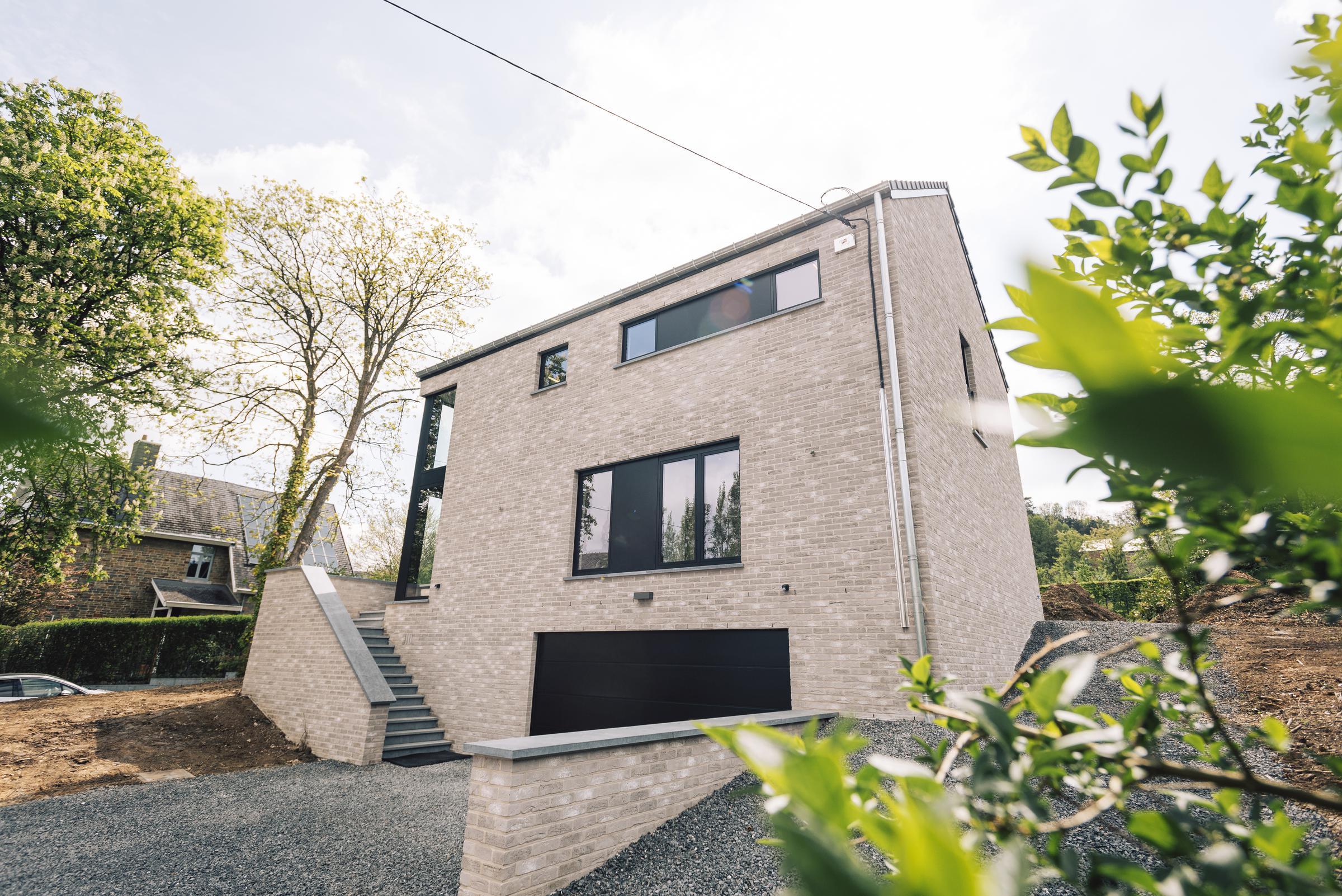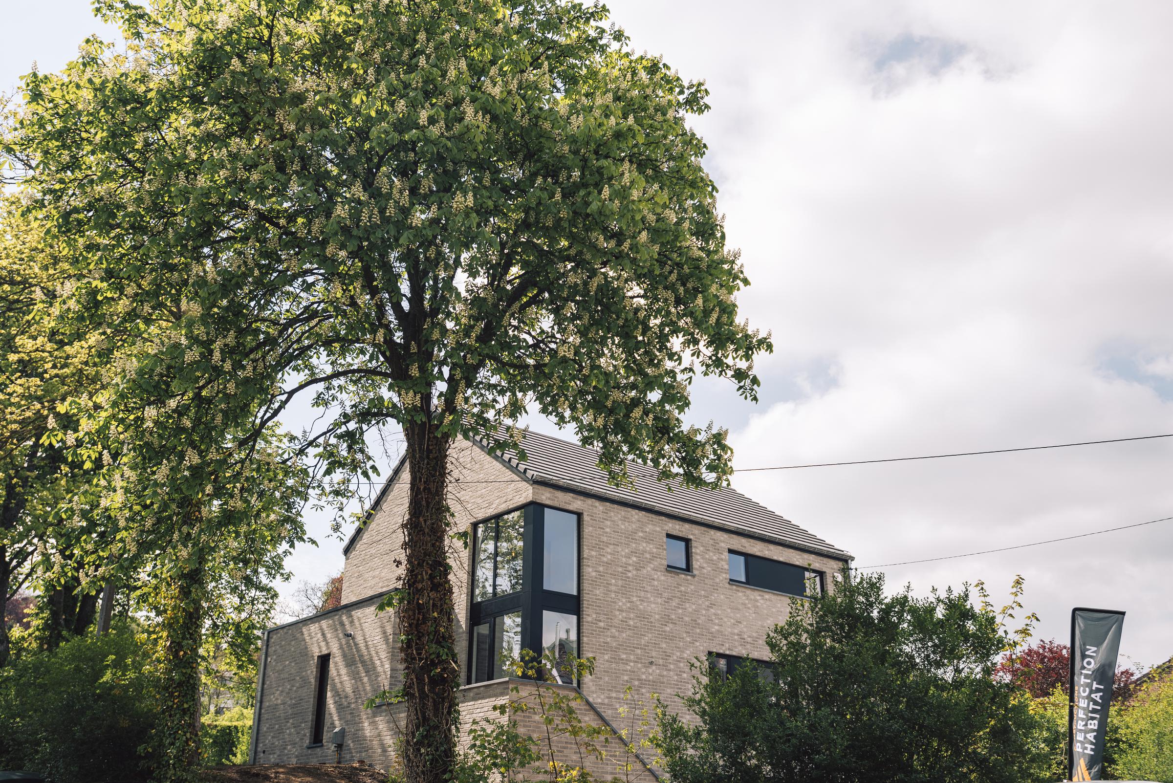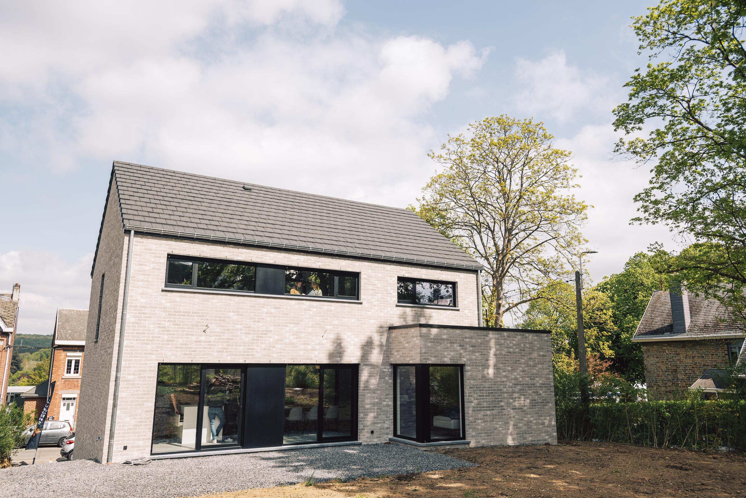 Nous avons construit cette habitation clé-sur-porte à Esneux dans la province de Liège. D’un style contemporain avec sa brique grise et le rejointoyage ton-sur-ton, elle a été conçue à partir des plans du modèle PH32.