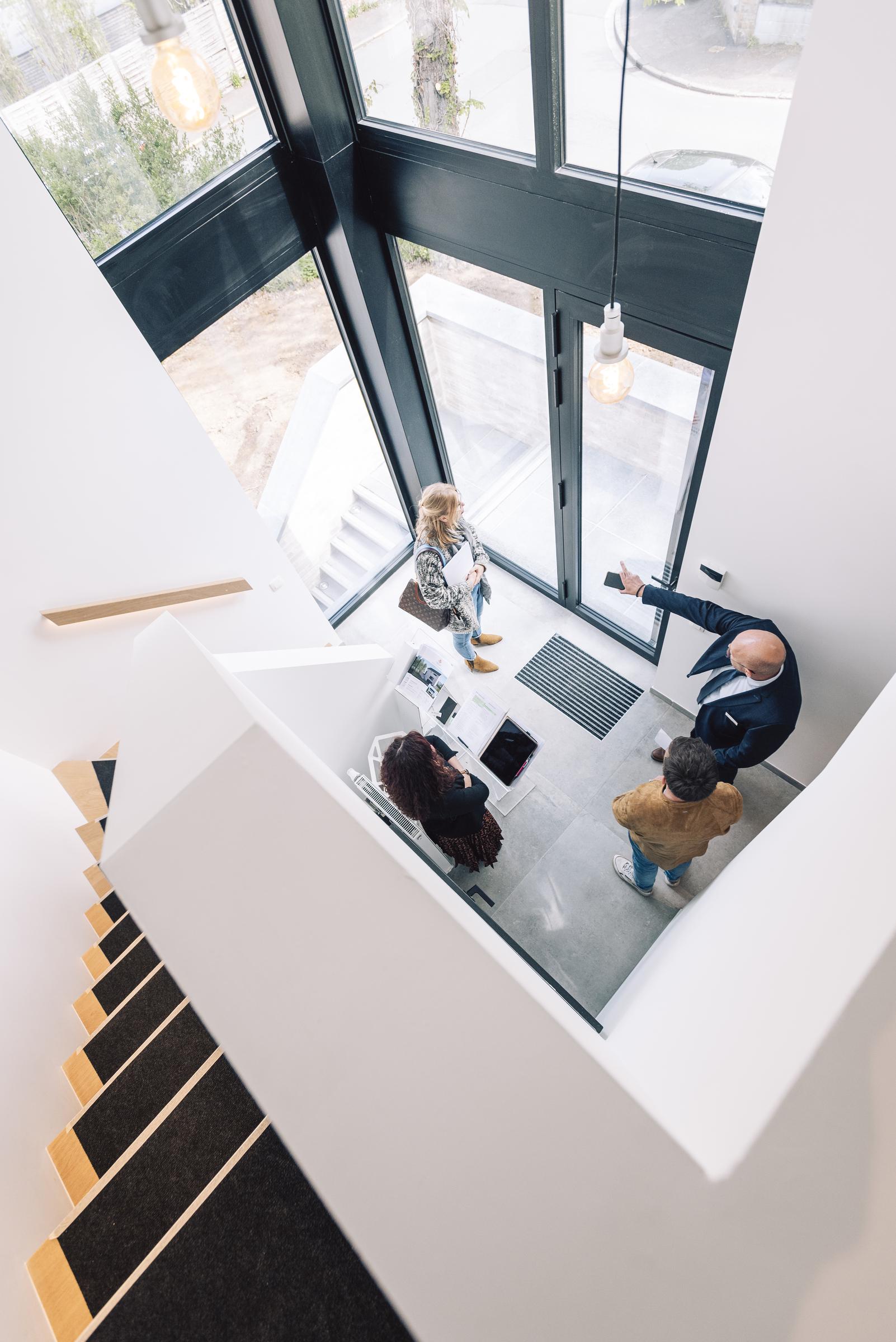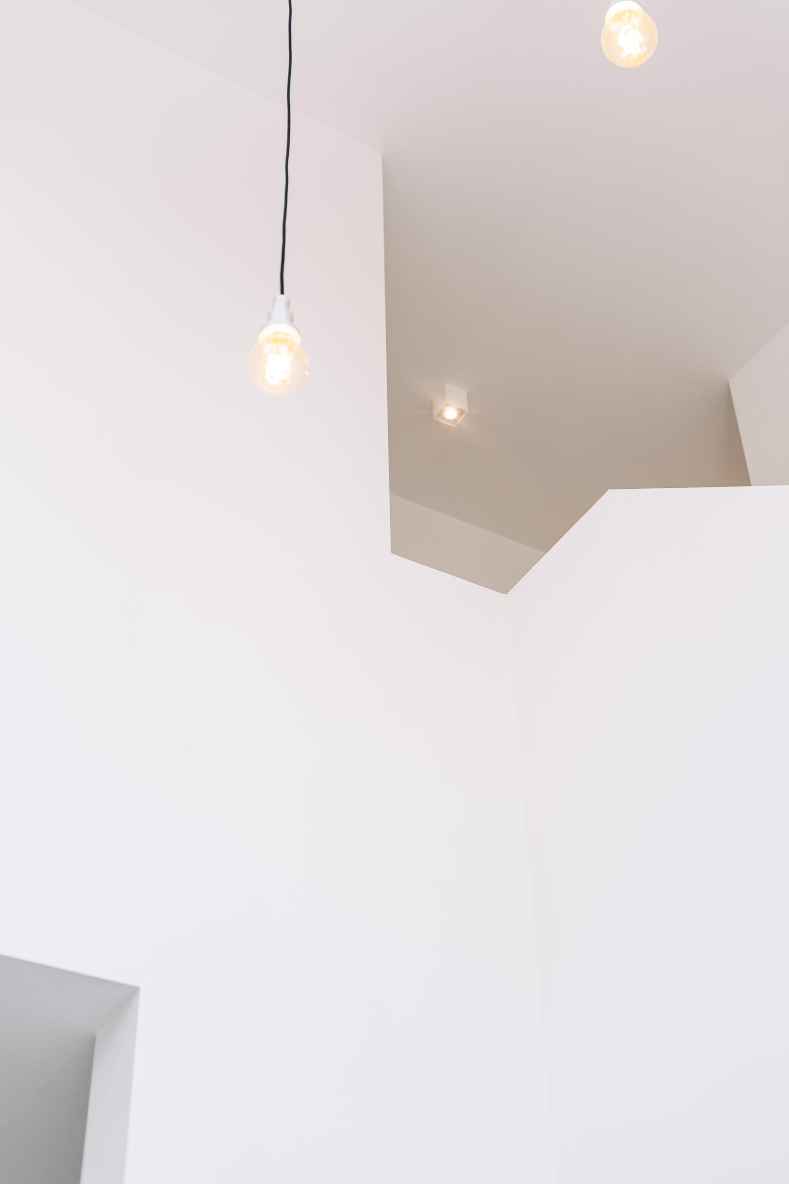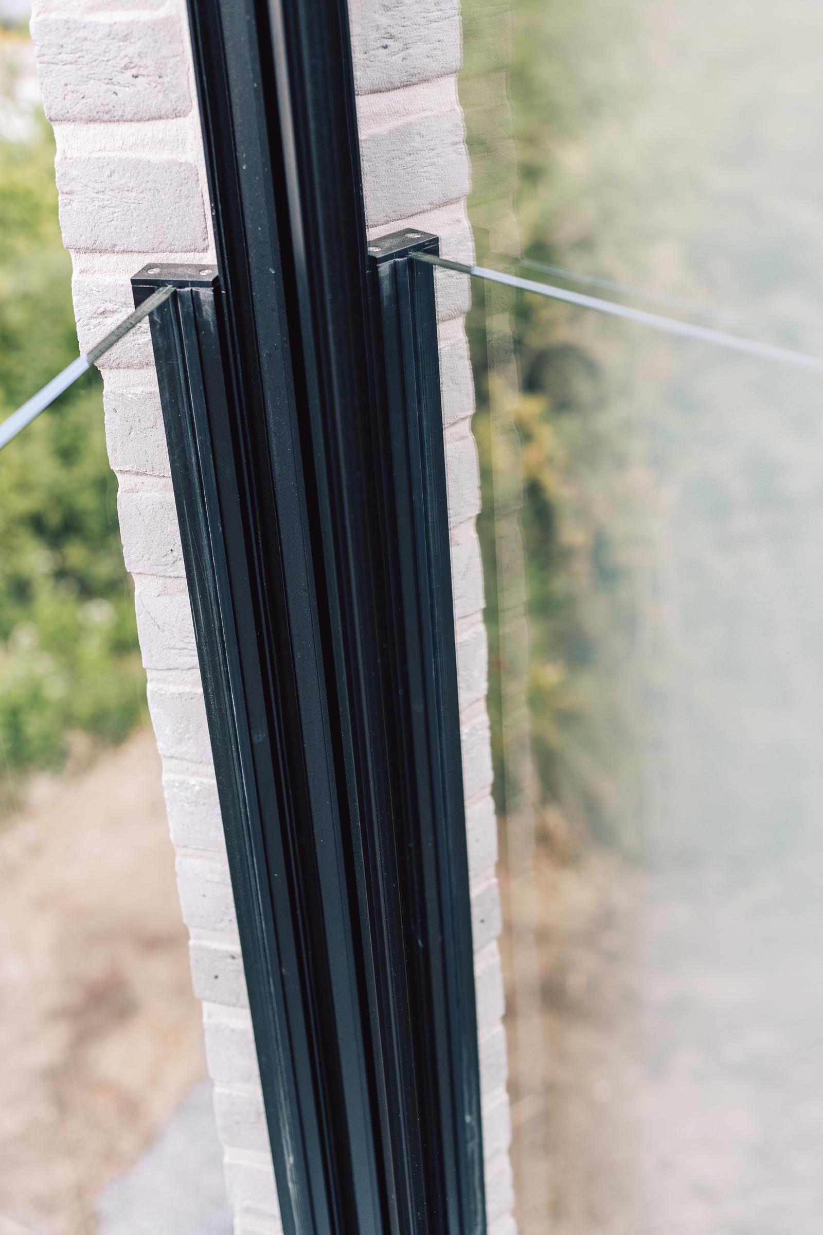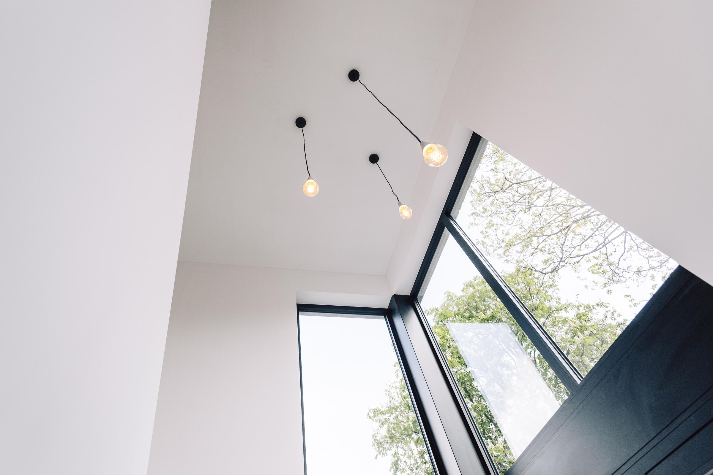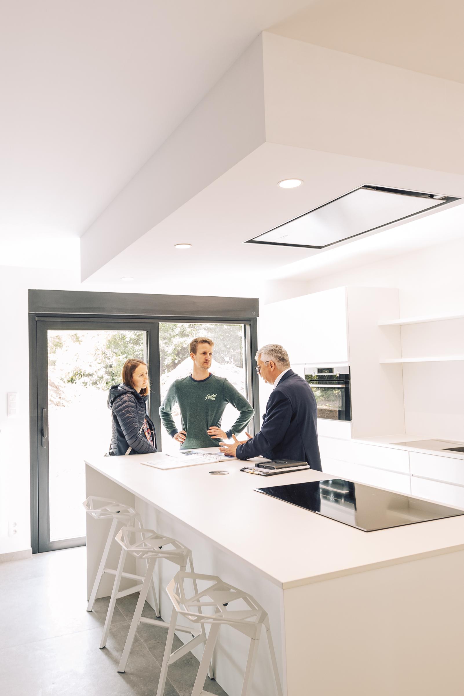 Plusieurs adaptations ont été apportées afin de répondre aux besoins et aux envies des propriétaires, et surtout pour s'adapter au terrain en pente montante : caves et garage sous toute la maison au rez-de-chaussée, ajout d'un volume sortant pour le coin salon au rez-de-jardin, agrandissement des volumes, grandes baies vitrées pour apporter un maximum de luminosité,...