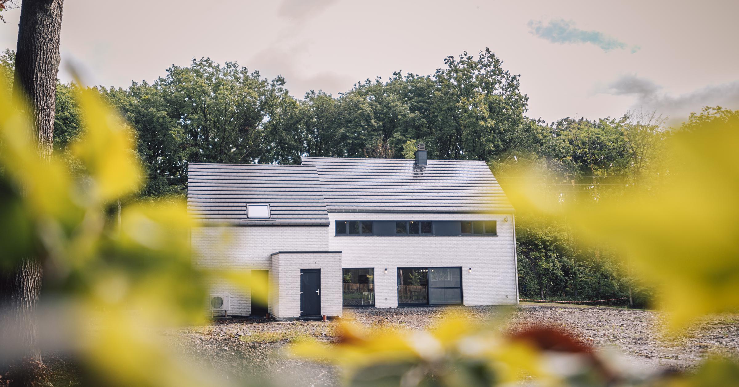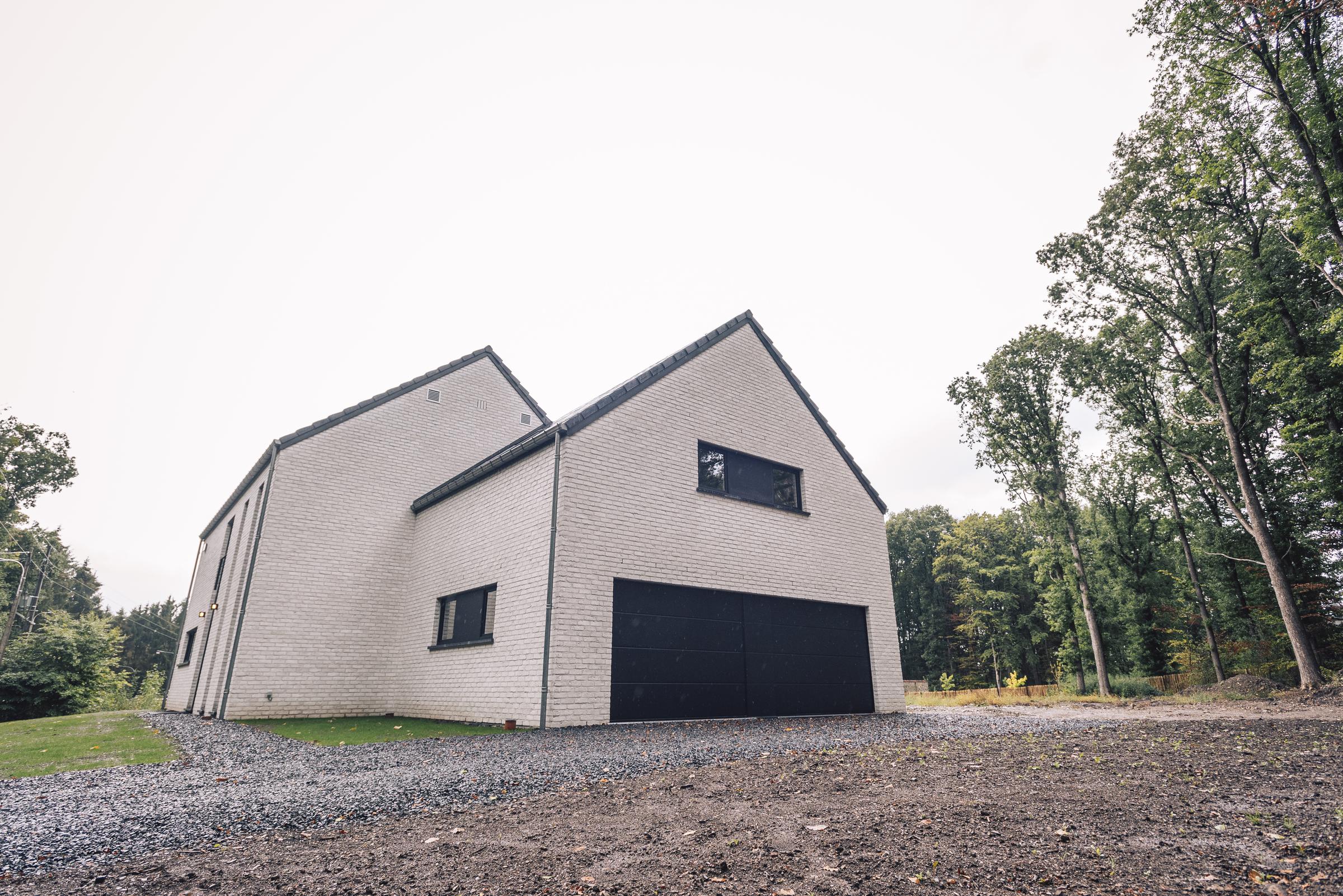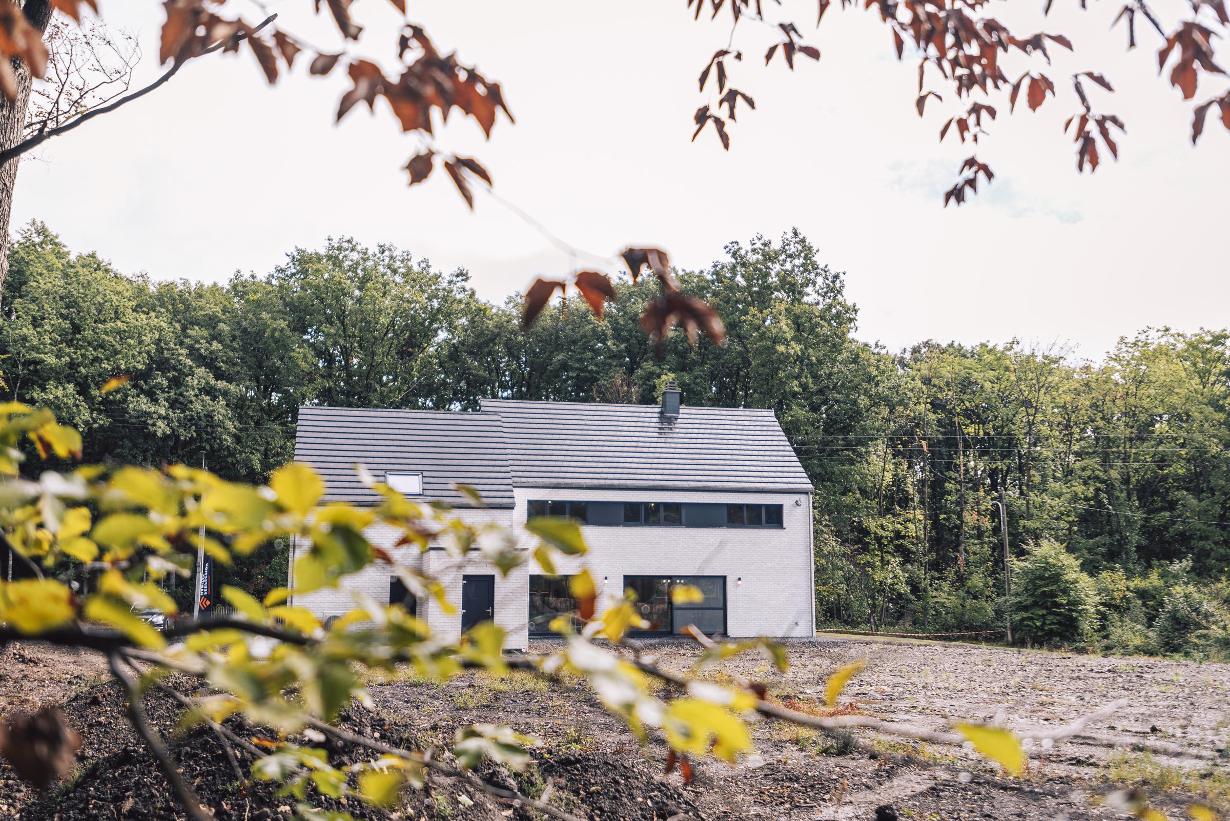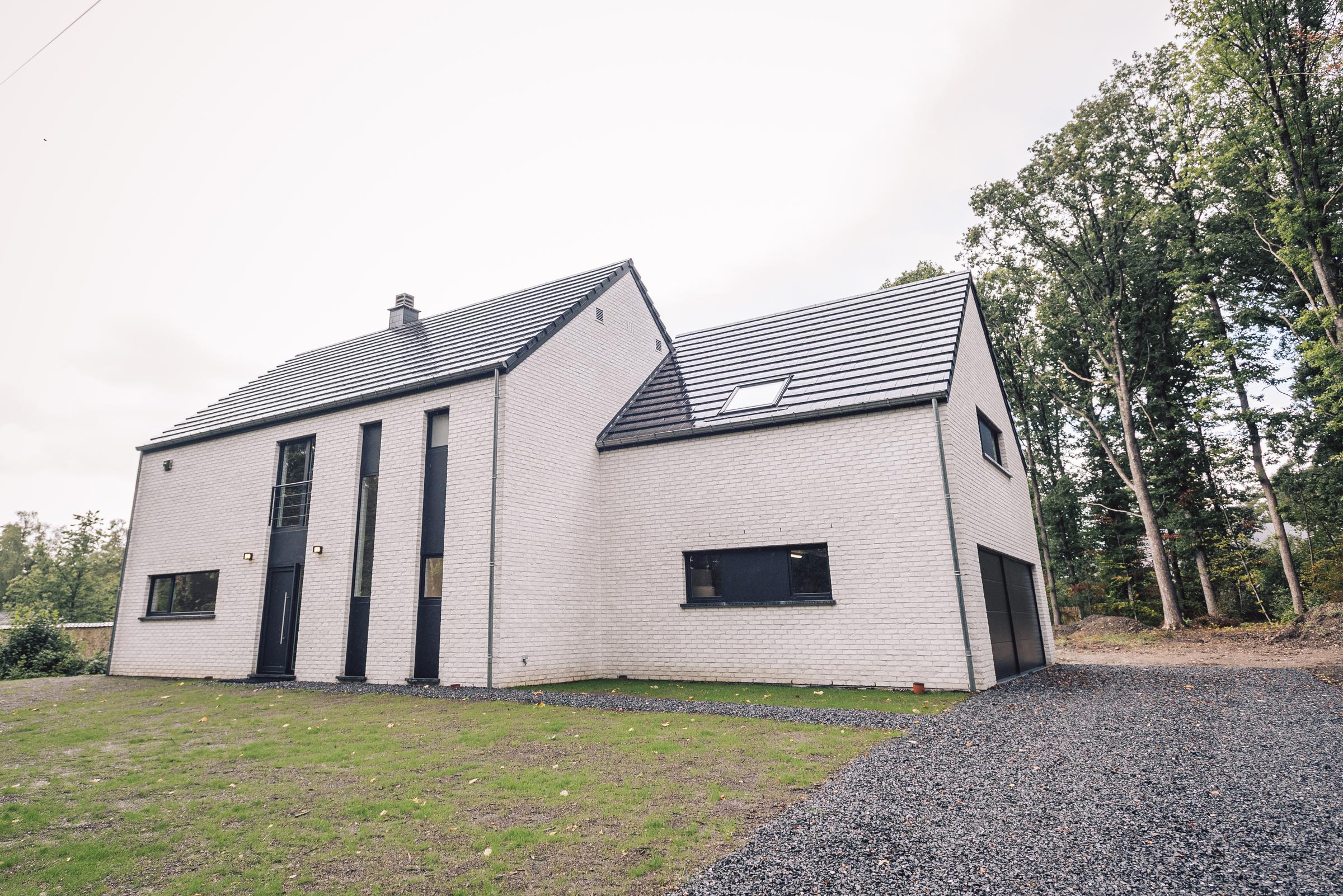 Nous avons construit cette maison clé sur porte à TROOZ, dans la province de Liège. D’un style moderne avec son revêtement en briques blanches et ses menuiseries extérieures noires, elle a été conçue à partir du modèle PH34.